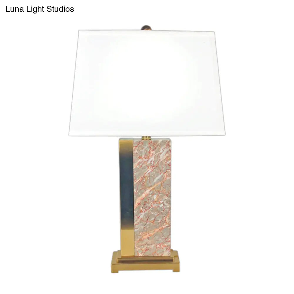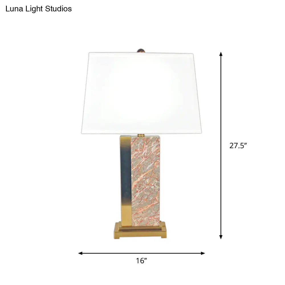 مصباح طاولة معاصر من القماش على شكل شبه منحرف - مصباح ليلي أبيض بمصباح واحد وقاعدة من الرخام الأحمر