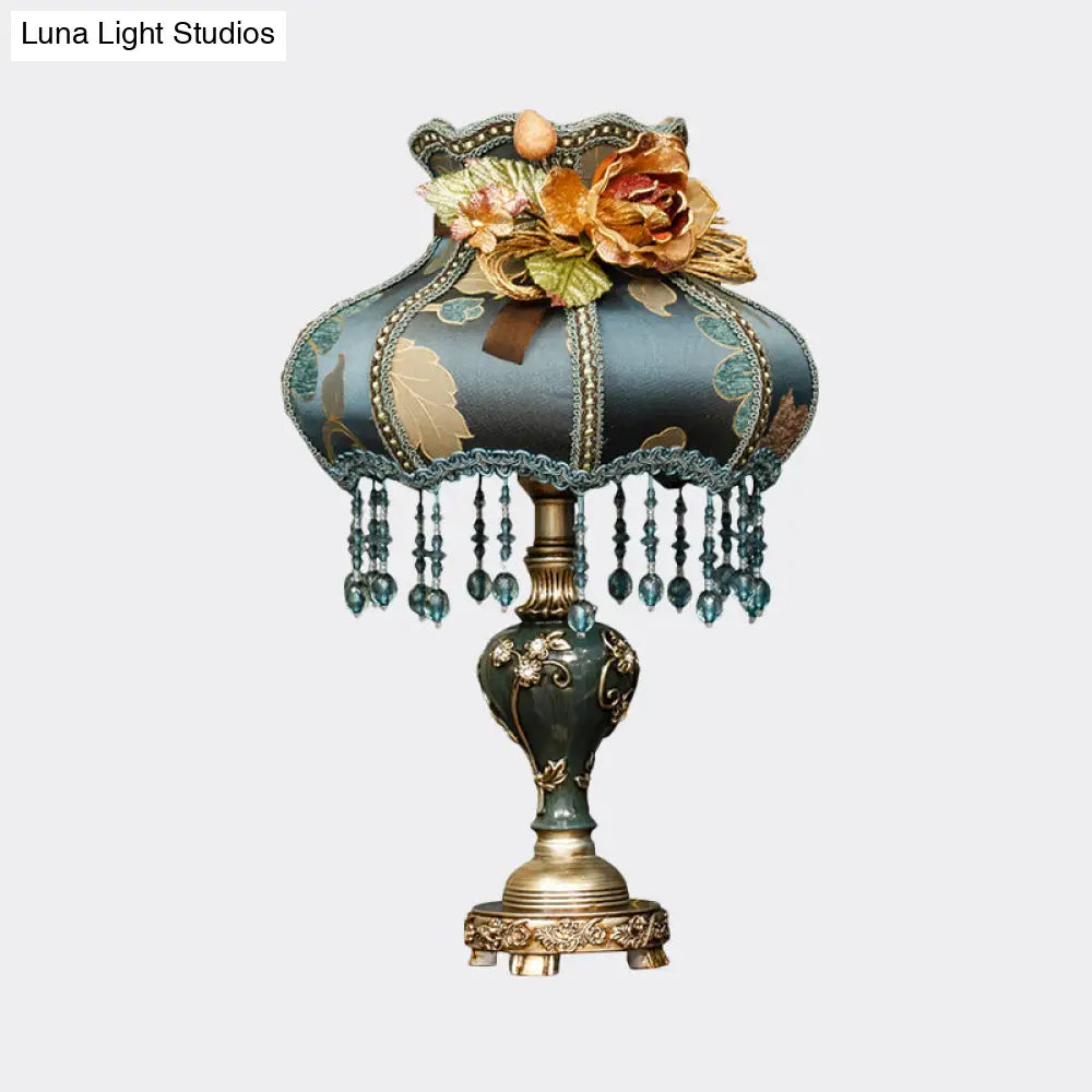 مصباح طاولة ليلي من الراتنج باللون الأزرق الداكن بتصميم منحوت وغطاء من القماش