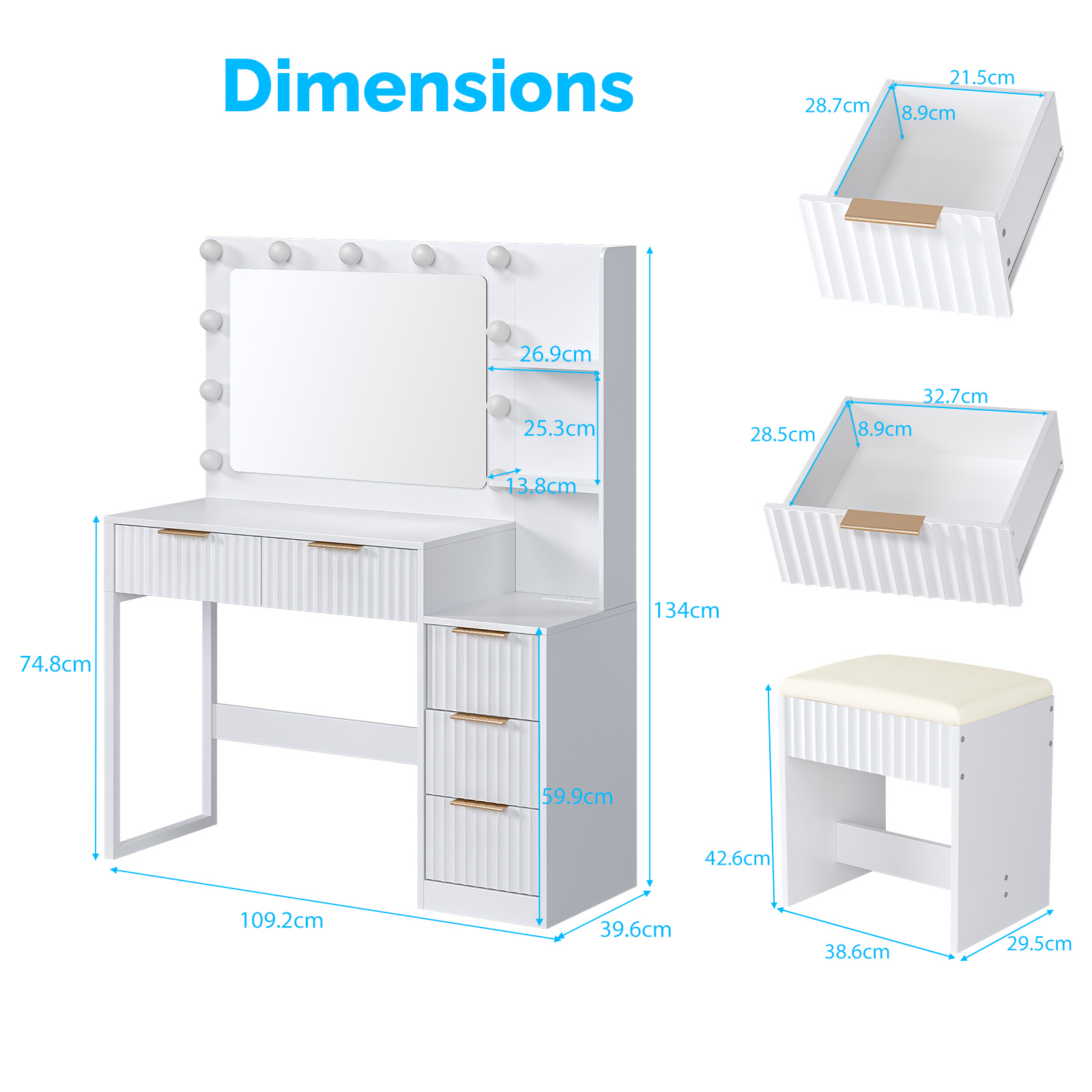 White Particleboard With A Melamine Finish, 5-drawer, 2-shelf Dressing Table Set With 11 Three-tone Light Bulbs, Power Strip, And Grille.