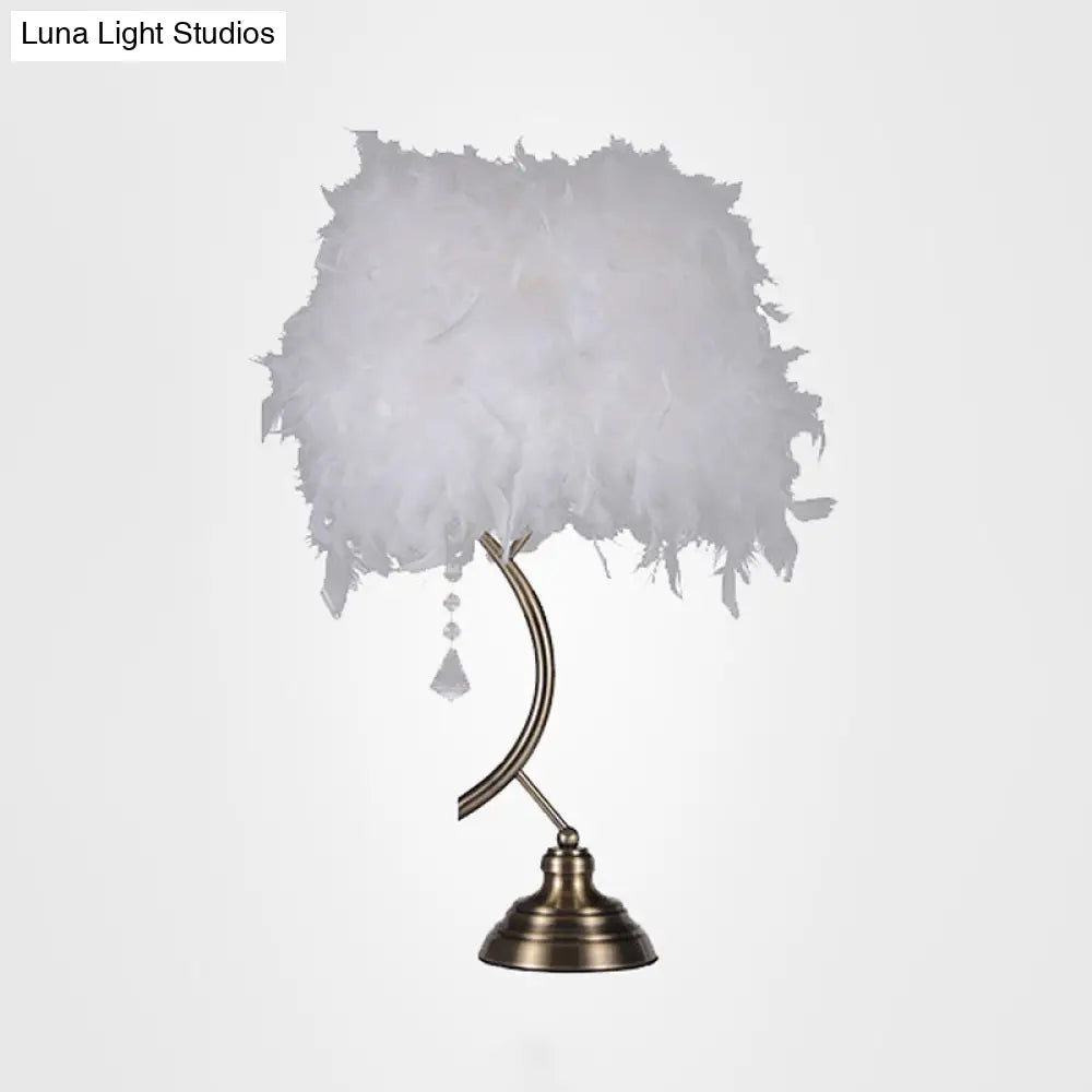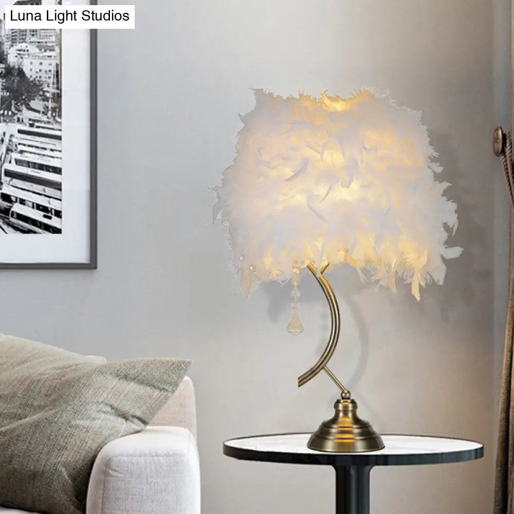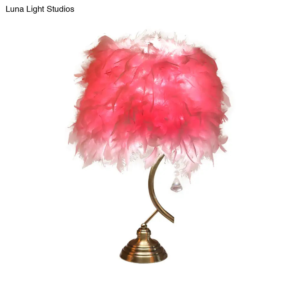 مصباح طاولة عصري باللونين الأبيض والوردي مع غطاء ريش وكريستال متدلٍ