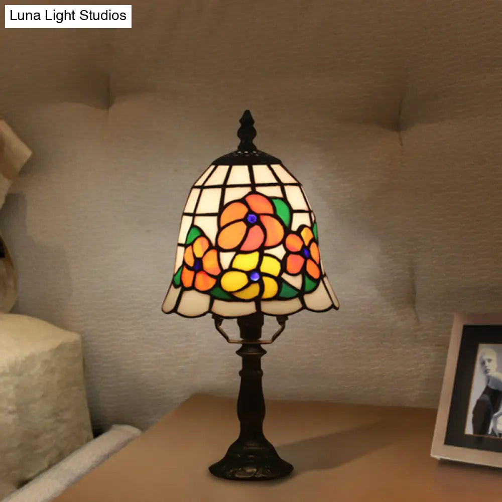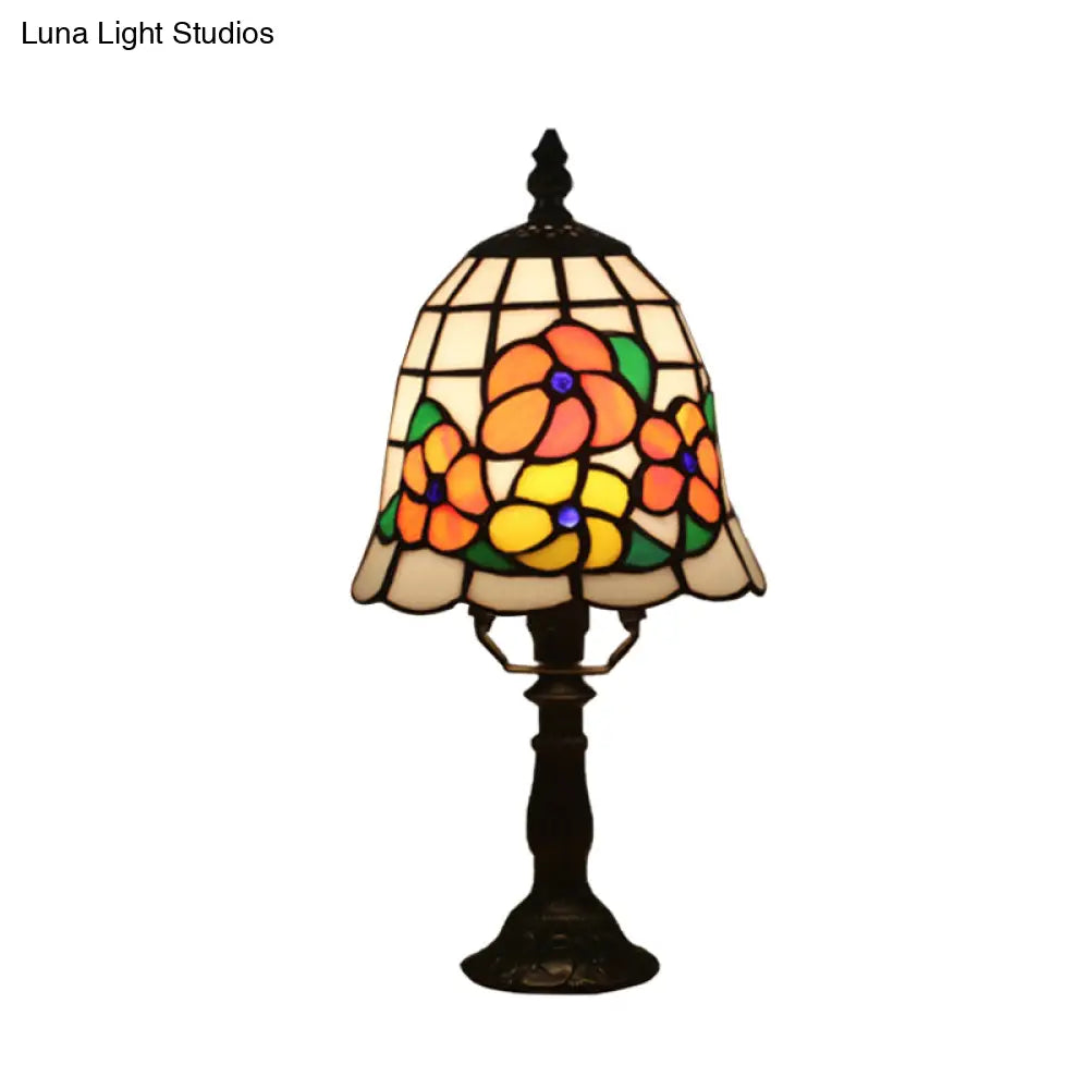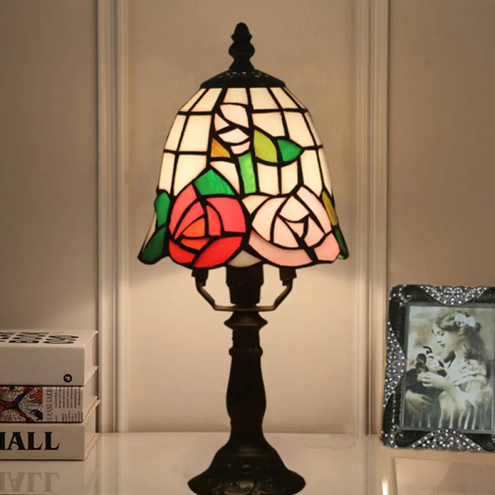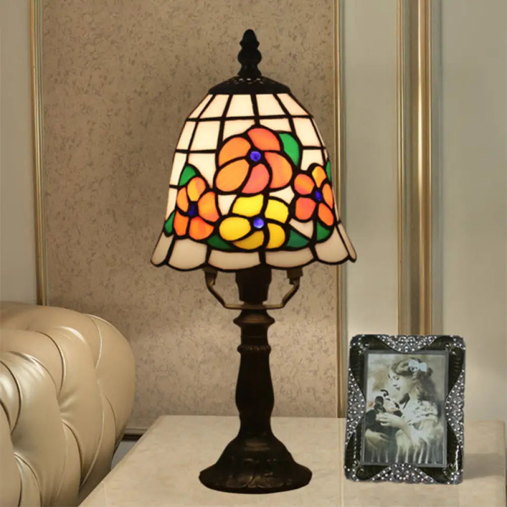 Lámpara de mesa de noche barroca con forma de campana y vidrieras artísticas en rosa/naranja - Diseño floral