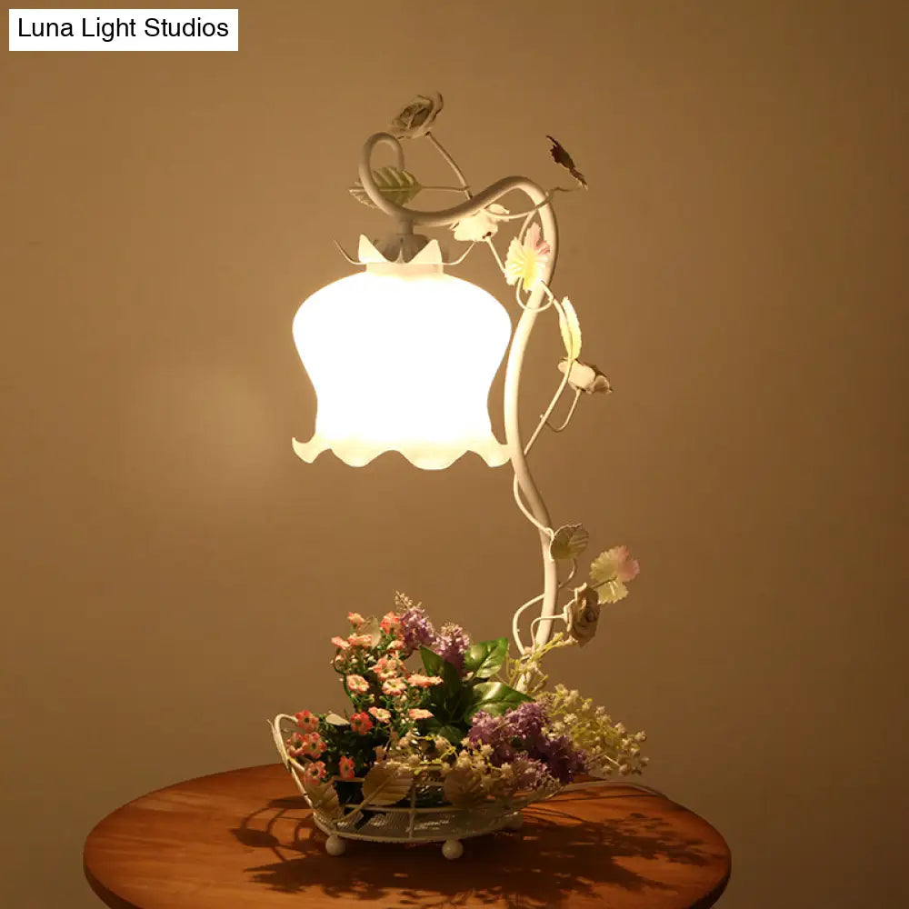Lámpara de mesa American Flower Night Light con pantalla de cristal blanco esmerilado con volantes en blanco/rojo - Lámpara de dormitorio de 1 luz