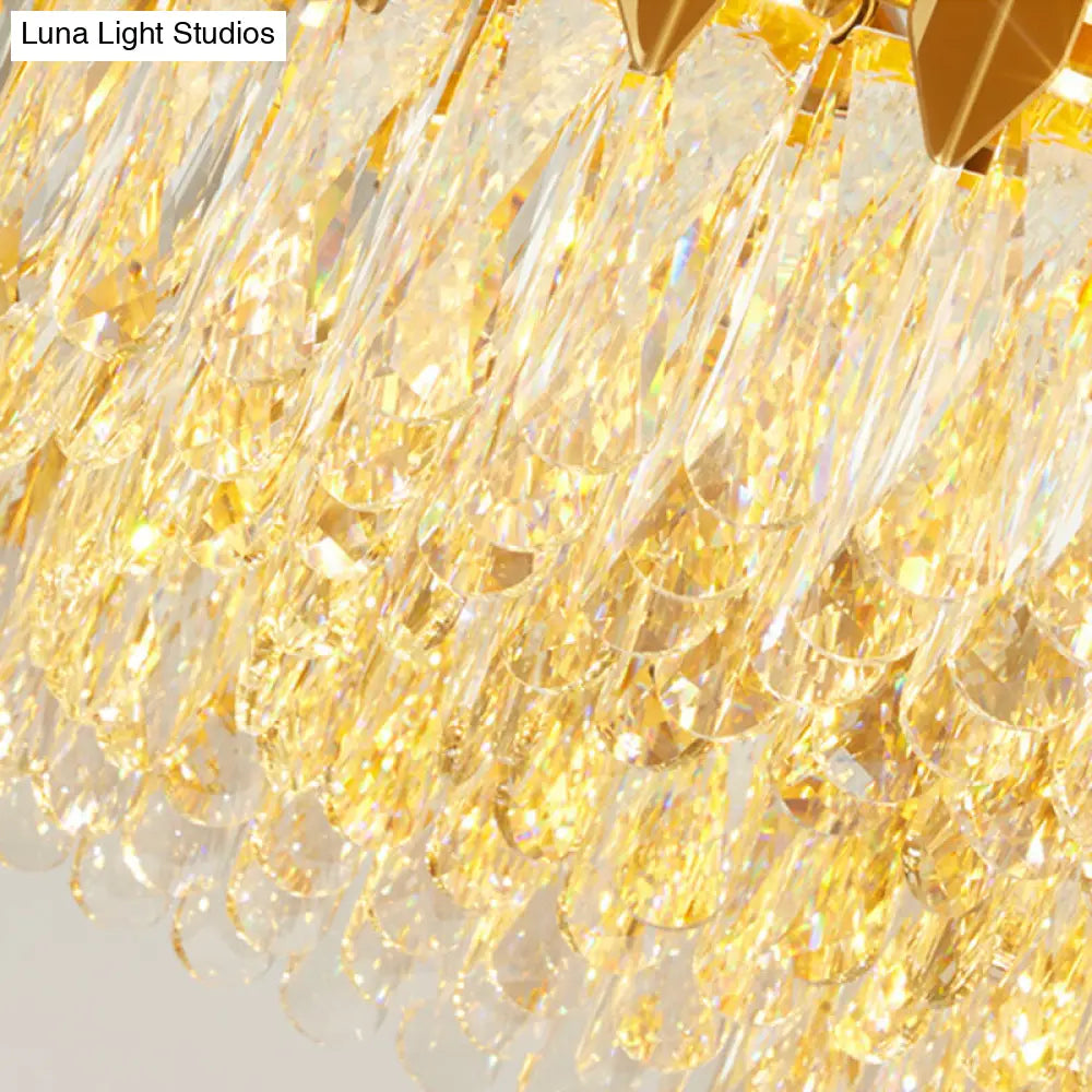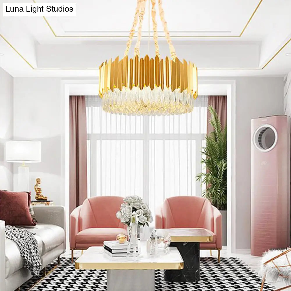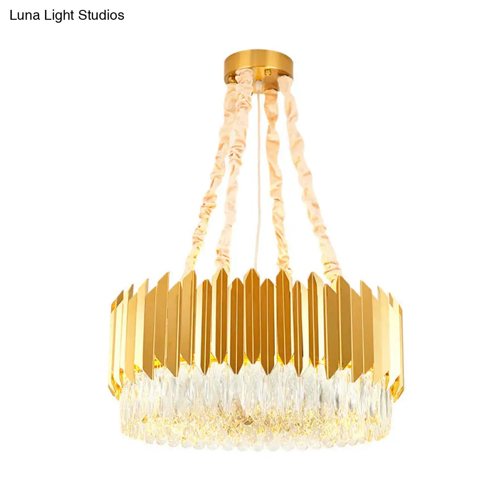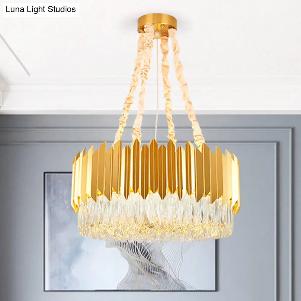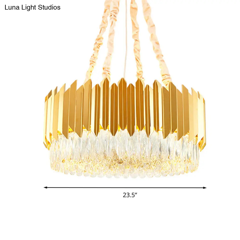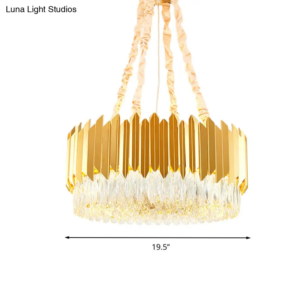 Lámpara de araña redonda dorada con colgantes de bloques de cristal - 19,5"/23,5" de ancho, diseño posmoderno - 6/10 cabezas