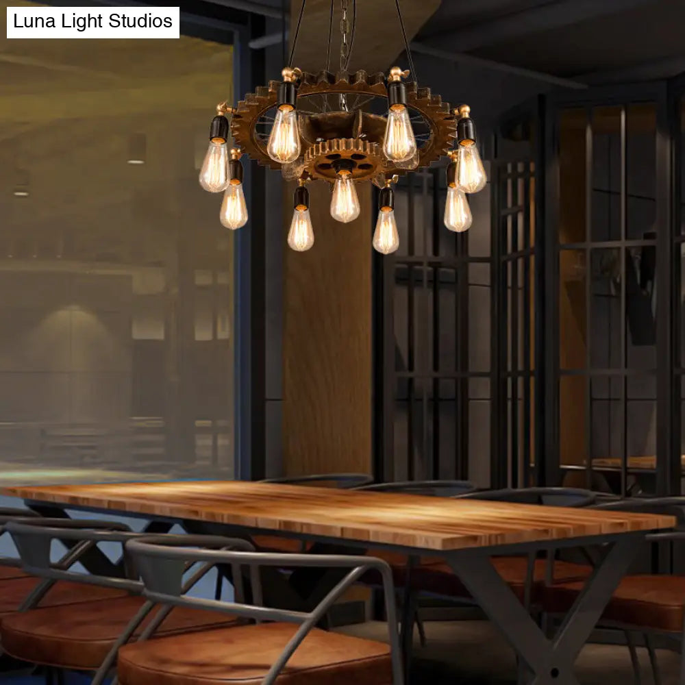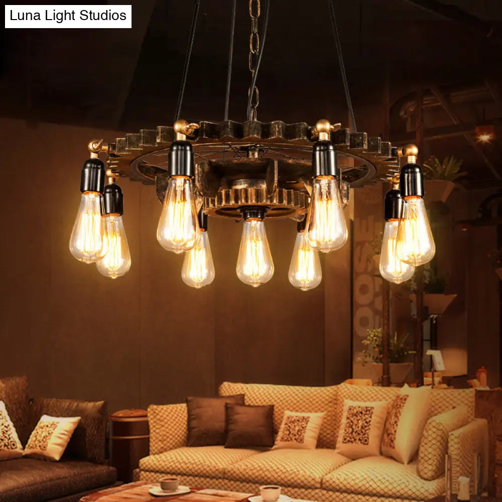 Lámpara de araña antigua de restaurante de dos niveles con nueve bombillas y soporte rústico suspendido