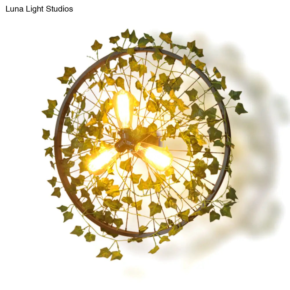 Aplique de pared estilo cabaña de metal negro con tres bombillas y decoración de hojas