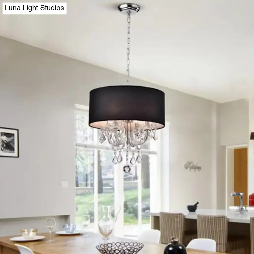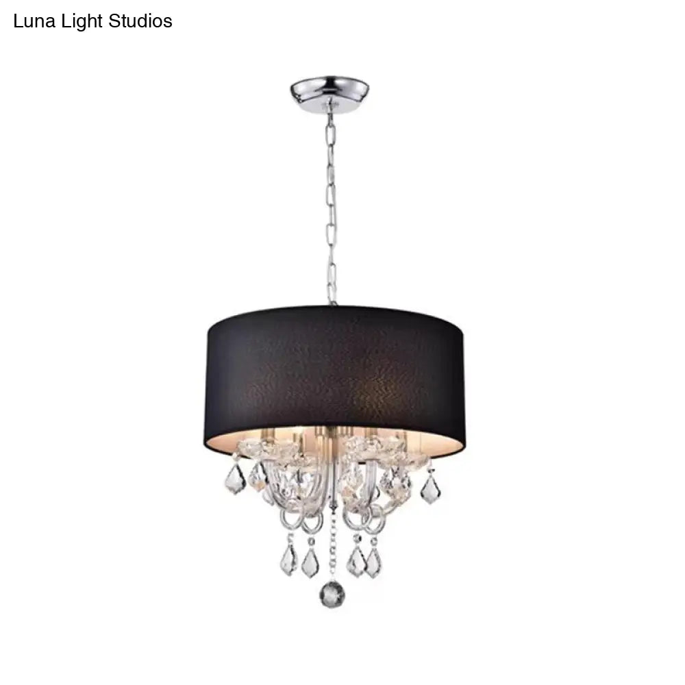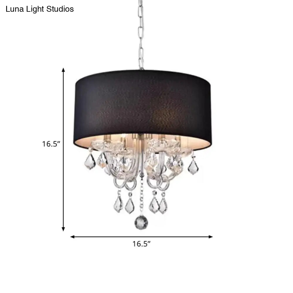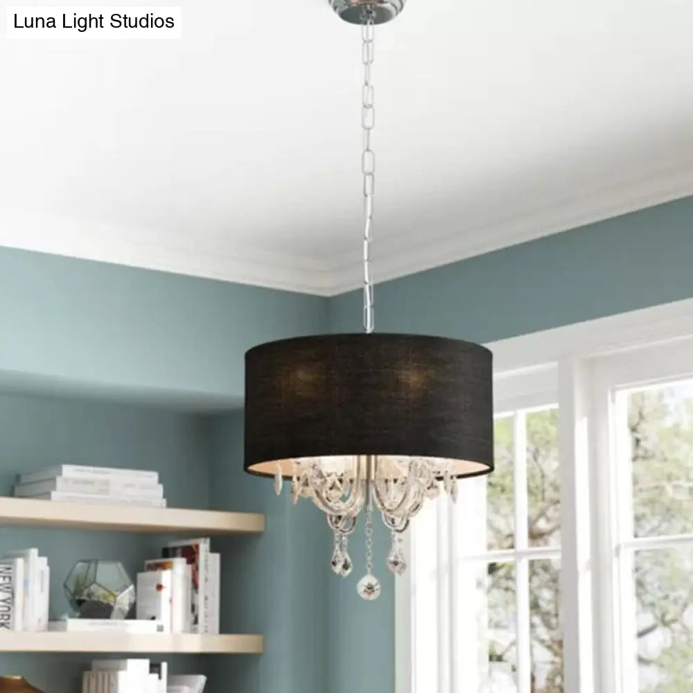 Lámpara de techo moderna de tela negra con forma de tambor y detalle de bola de cristal