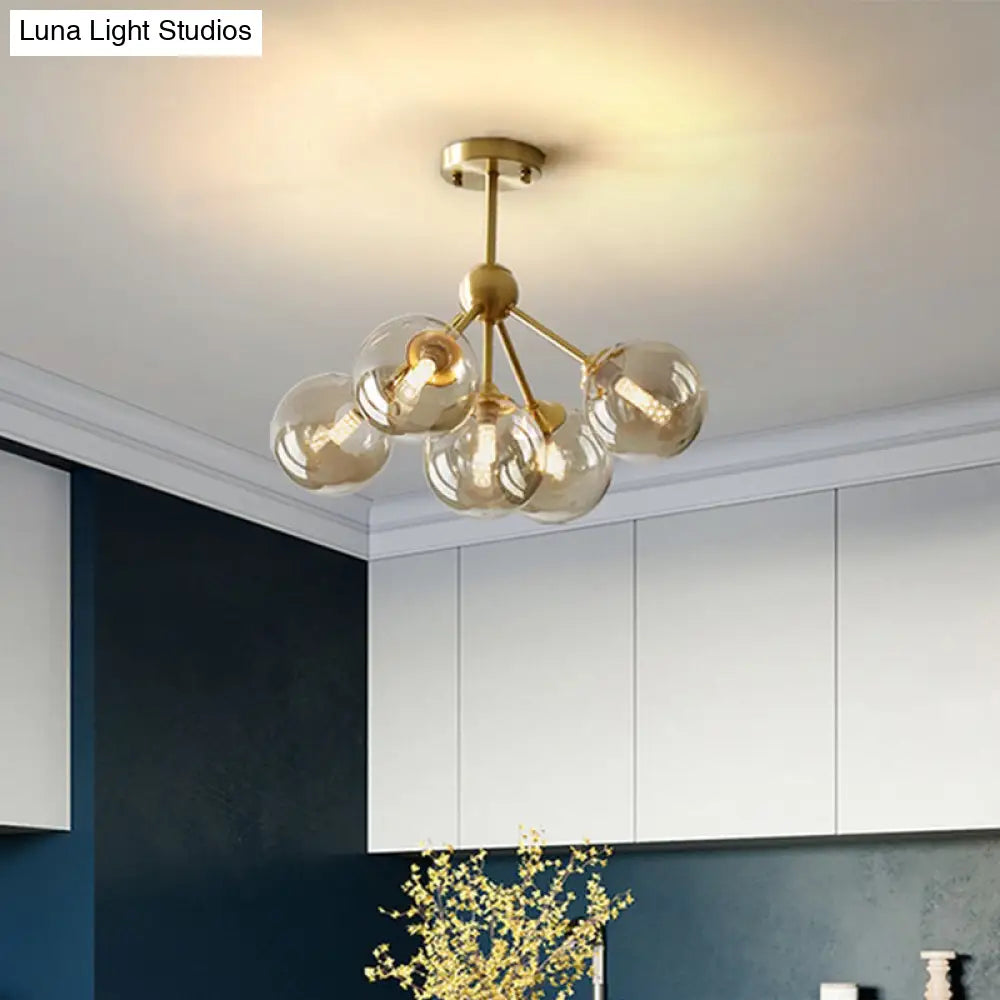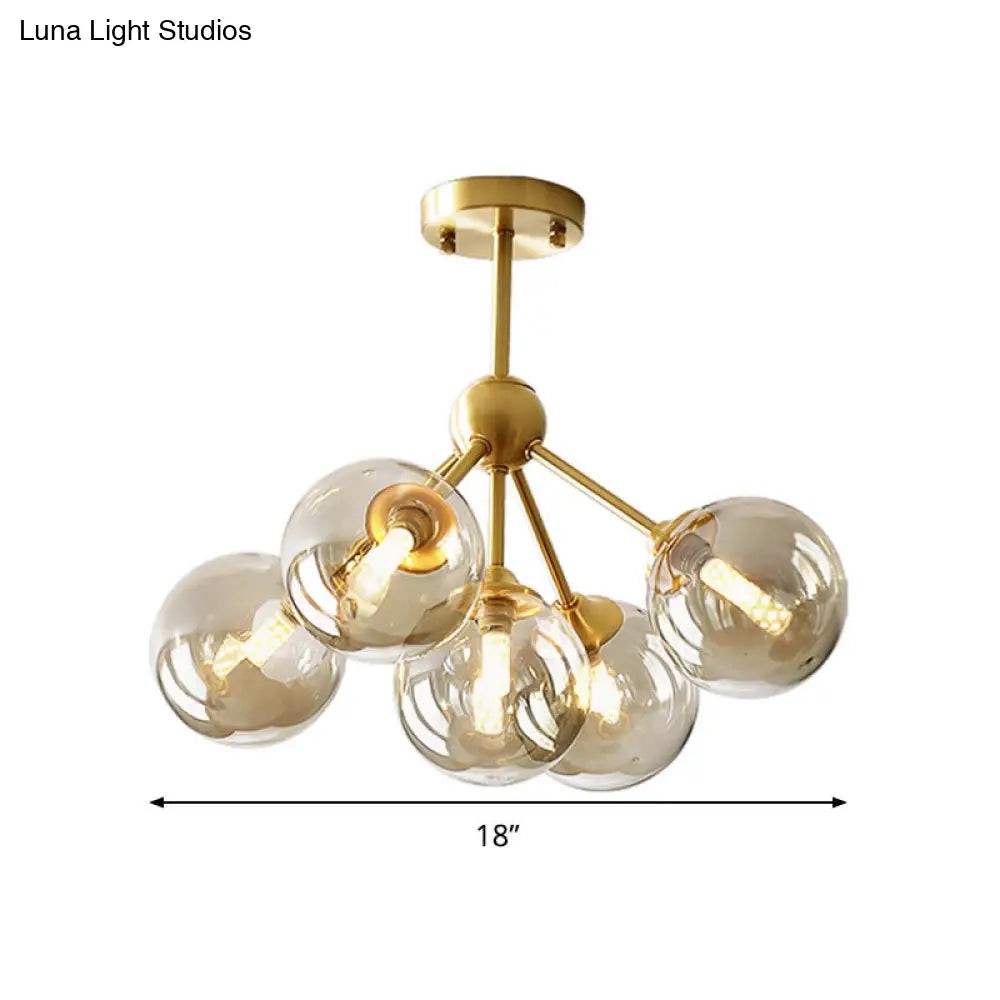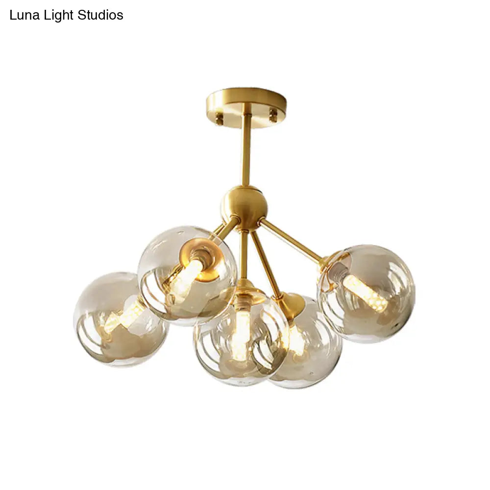 Lámpara de techo colgante moderna de latón con 5 pantallas esféricas de cristal ámbar - Kit de iluminación colgante para comedor