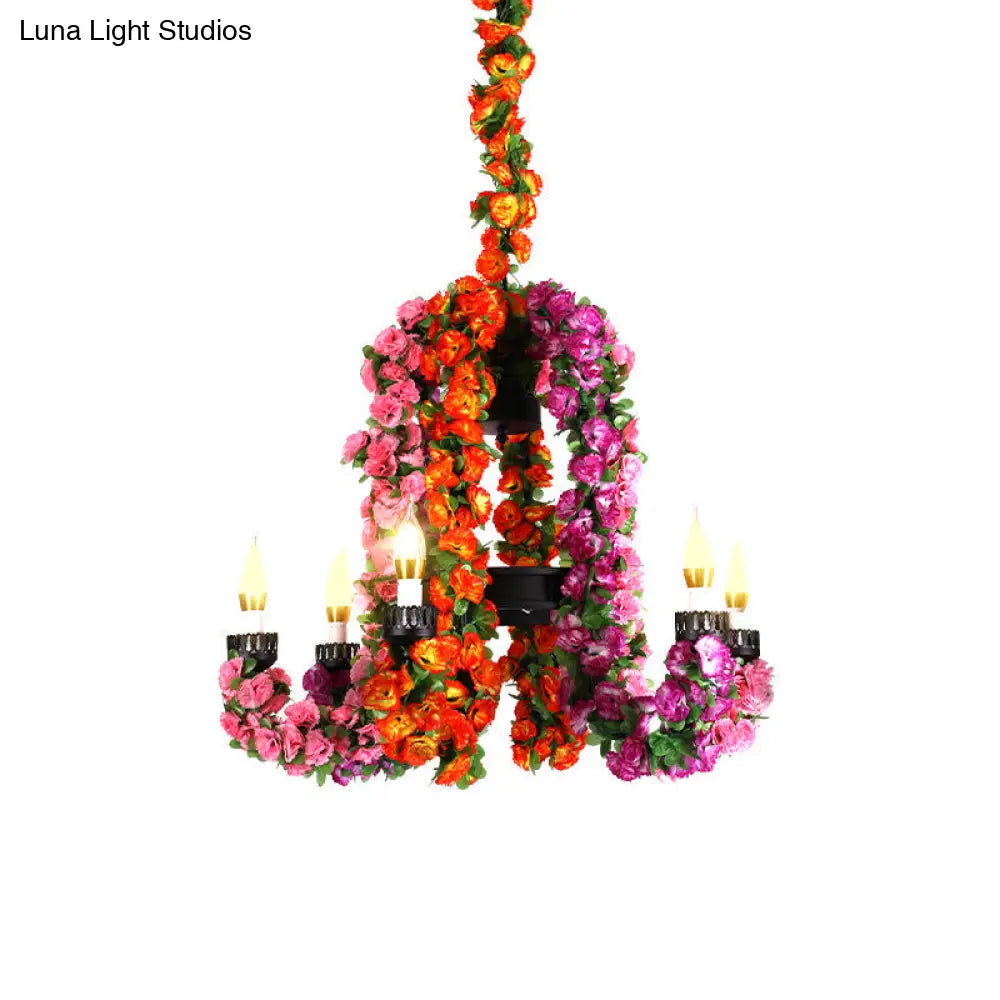Kit de lámpara colgante metálica de 6 cabezales: Lámpara de araña morada con brazo curvo y decoración floral - Iluminación industrial para restaurantes