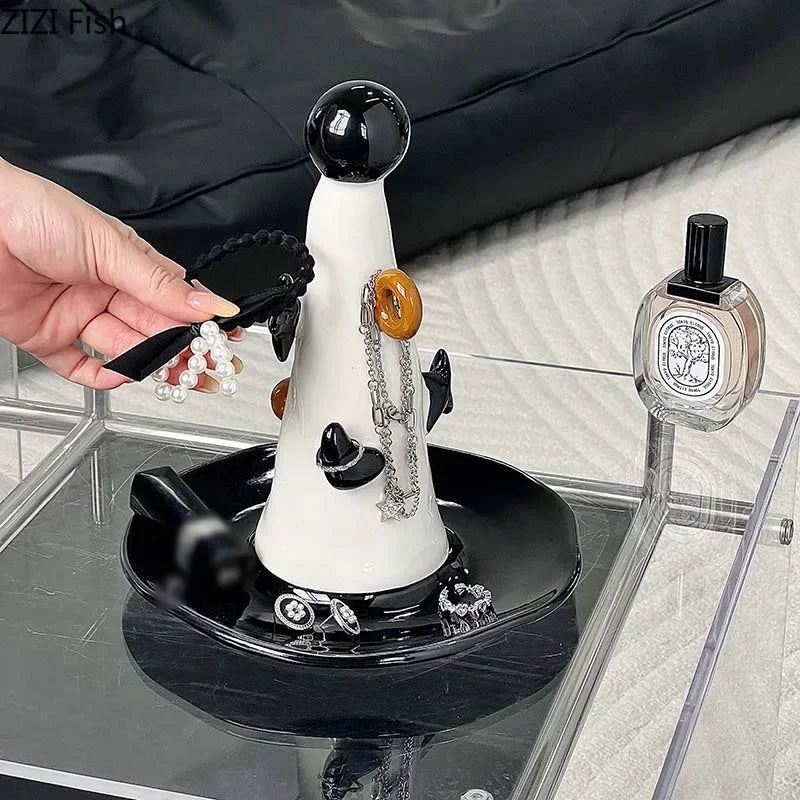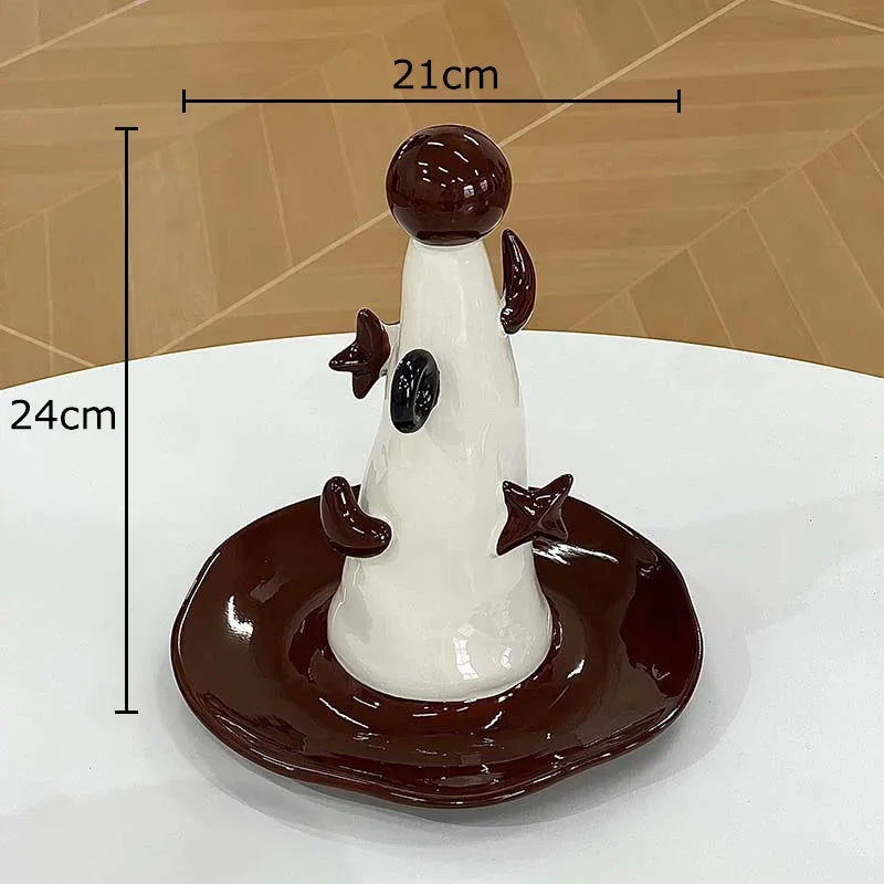 Presentamos el expositor de joyas con forma de sombrero de mago de Decorbites, un complemento elegante y funcional para tu decoración. Fabricado en cerámica de alta calidad, este expositor está diseñado para lucir con estilo tus pendientes, collares y demás accesorios.