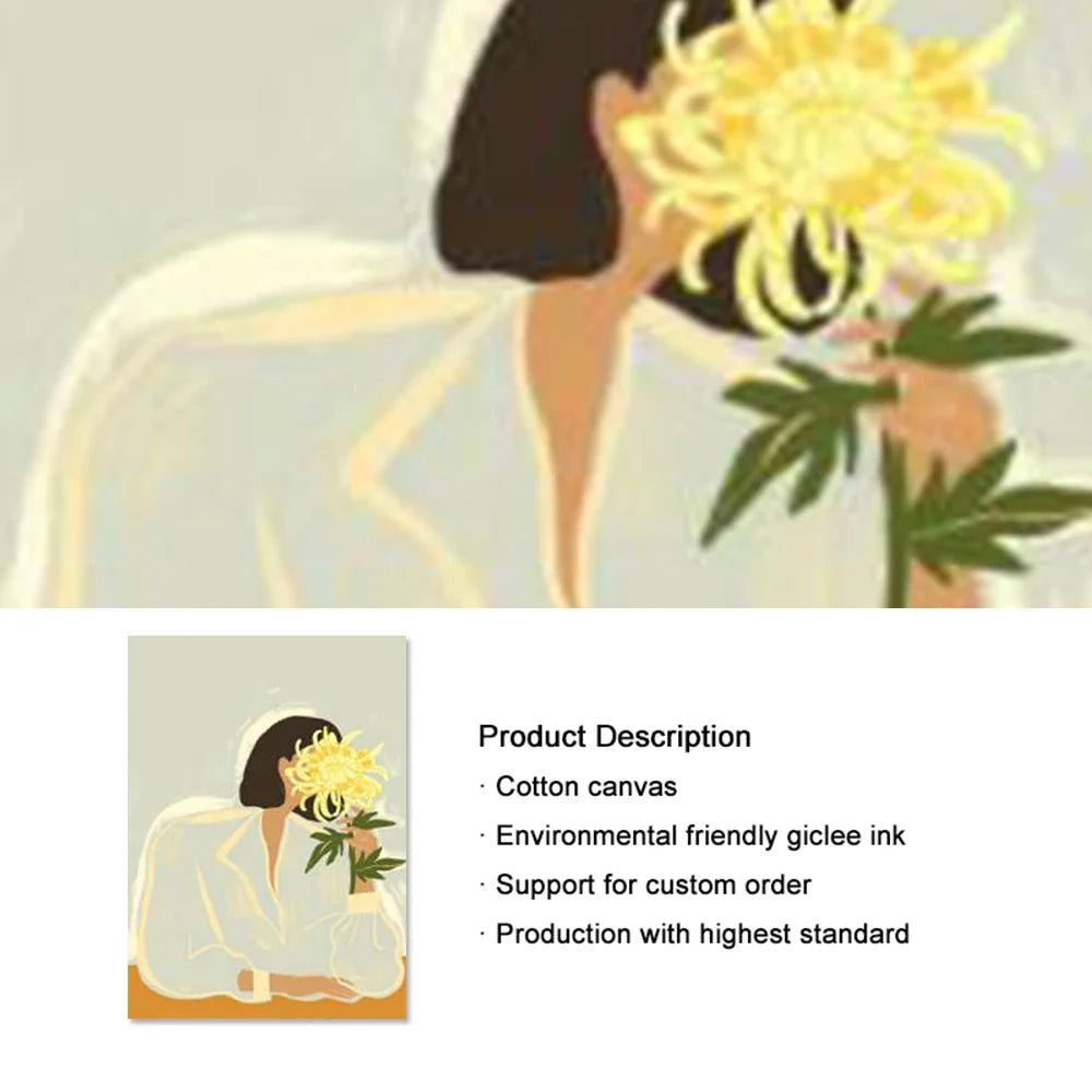Pintura abstracta de lienzo con diseño de niña, mano, fruta, flor, hoja, jarrón, arte de pared