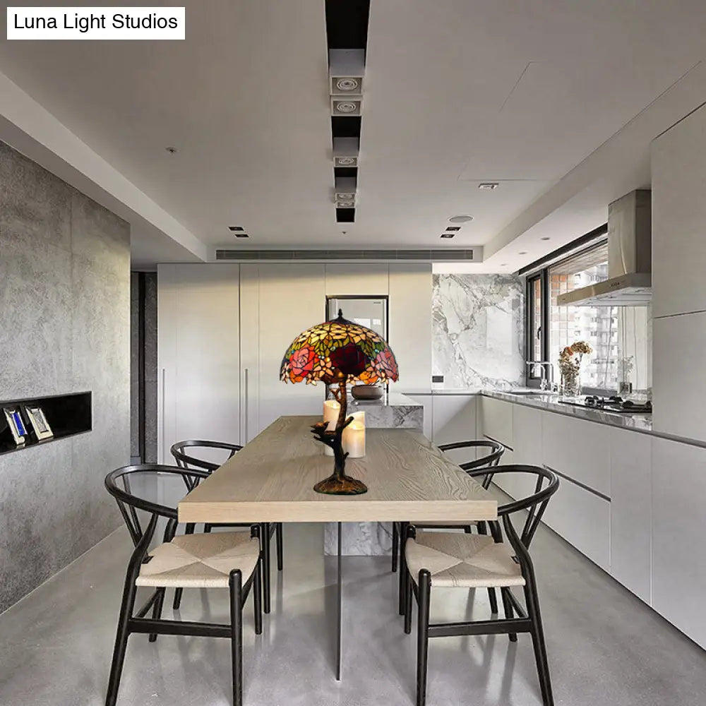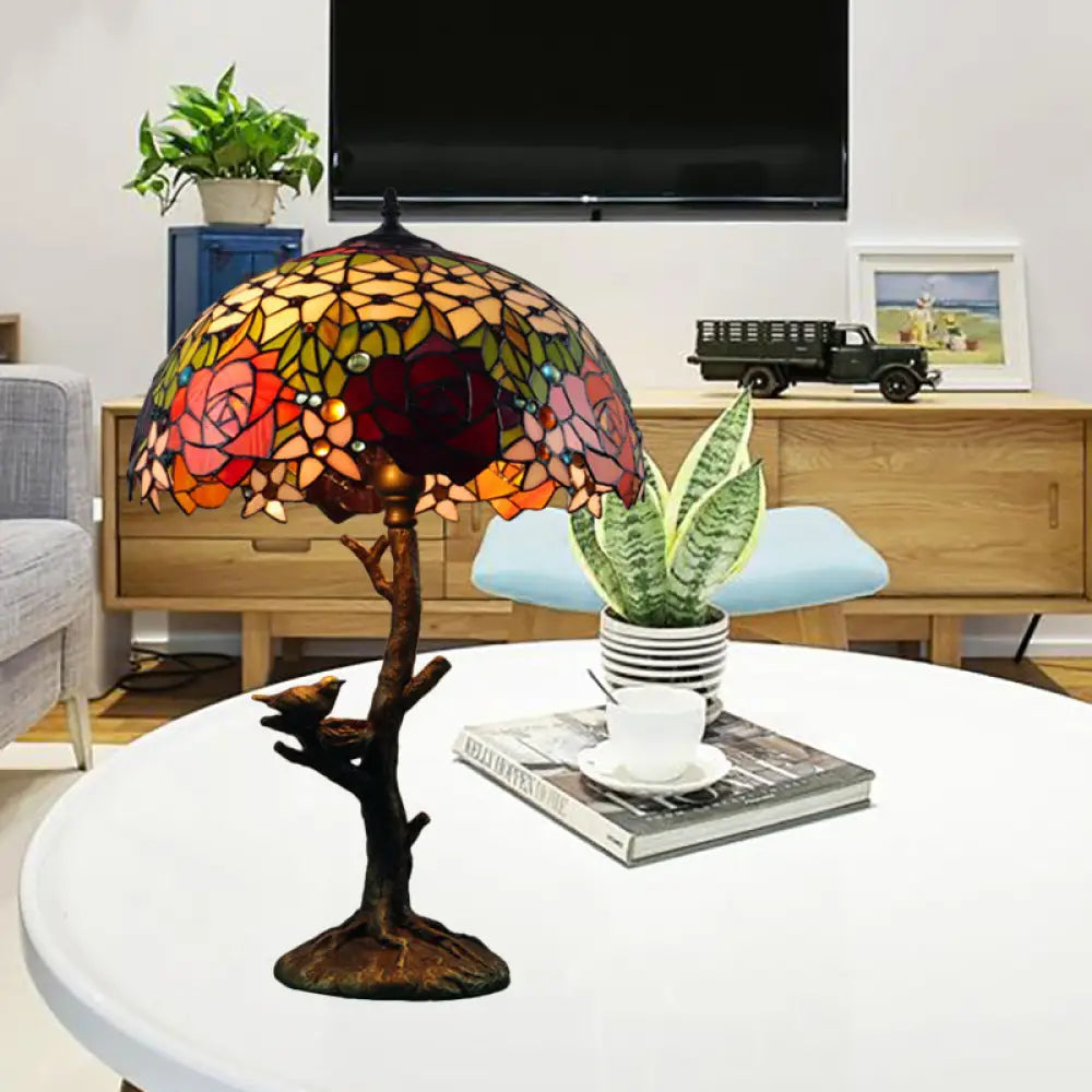 Lámpara de noche antigua de latón con una luz, diseño victoriano y rosa de vidrieras, libélula y motivo de cama.