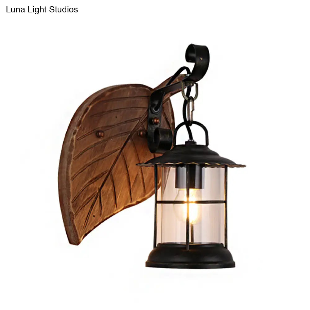 Aplique de pared antiguo de queroseno con cristal transparente y placa trasera de madera con forma de hoja/llave para iluminación de comedor