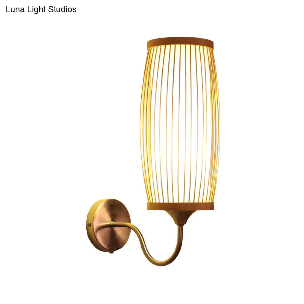 Aplique de pared estilo asiático con forma de barril de bambú y pantalla color pergamino - Un solo cabezal, acabado beige