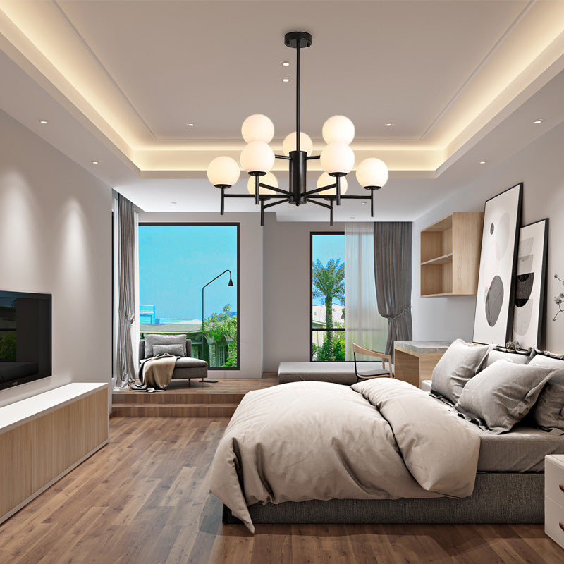 Lámpara de araña contemporánea negra y dorada con forma de globo y diseño radial - 6/8/9 luces, lámpara colgante de cristal opalino