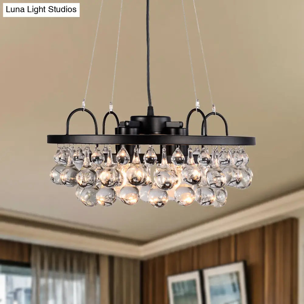 Lámpara de araña vintage redonda de metal negro - Lámpara colgante de 4 luces con gota de cristal