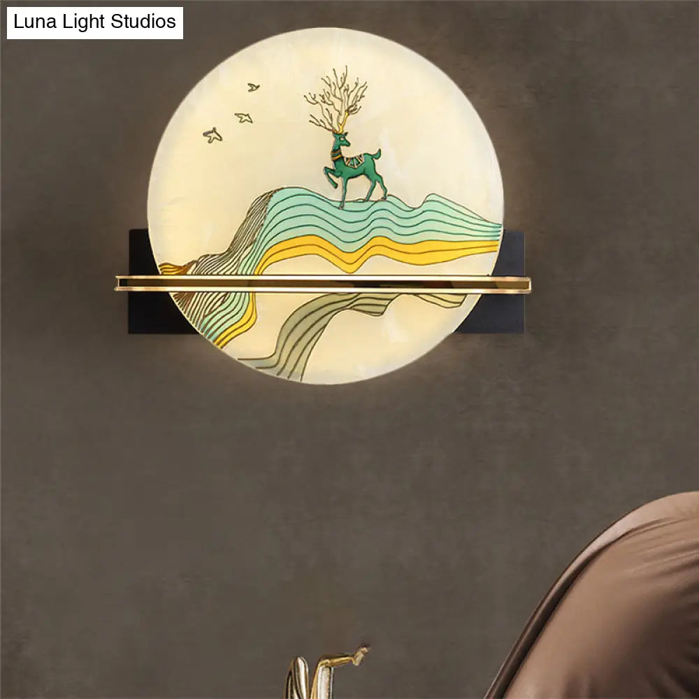 Aplique de pared LED de estilo oriental negro con diseño de ciervo/pez - Superficie acrílica, diseño redondeado