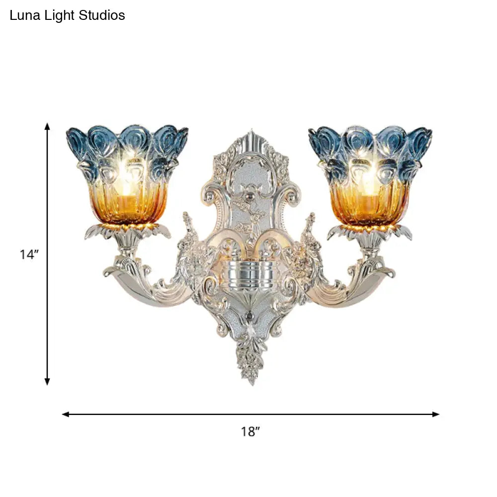 Aplique Blossom: Clásico cristal acanalado azul y amarillo, 2 luces, iluminación de pared plateada