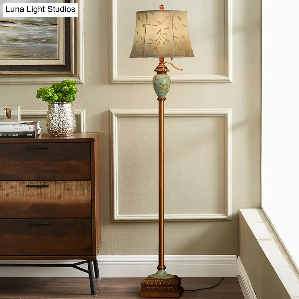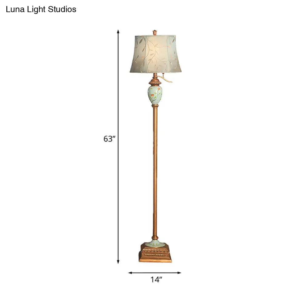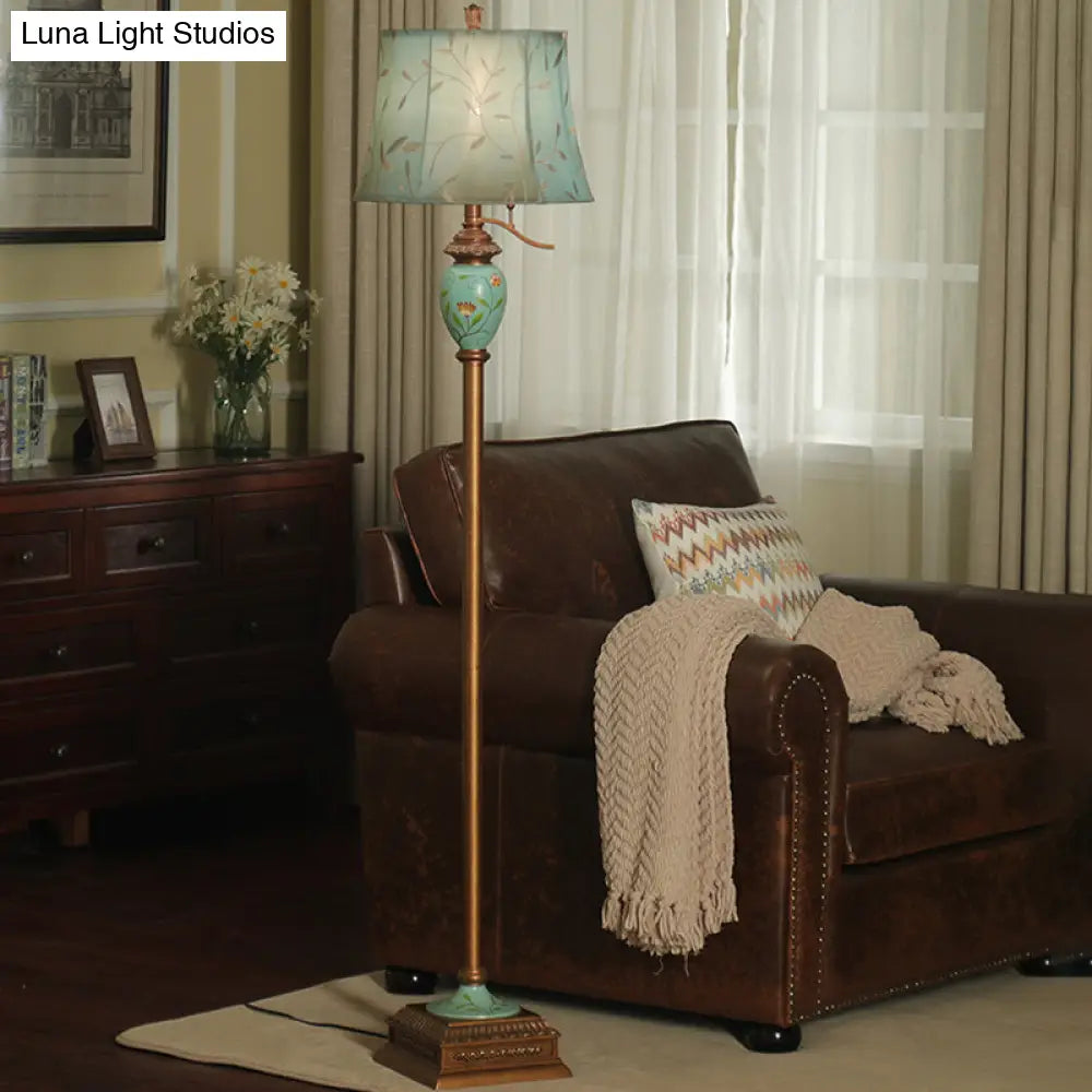 Lámpara de pie rústica azul con pantalla estampada con motivos de enredaderas curvas