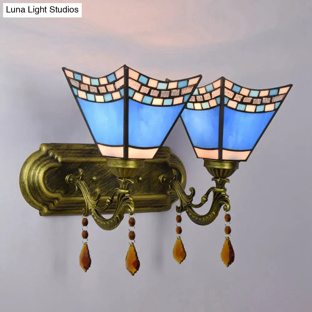 Aplique de pared Artisan Blue: Lámpara de pared mediterránea de vitral con 2 bombillas de ágata para vestíbulo