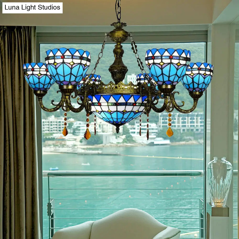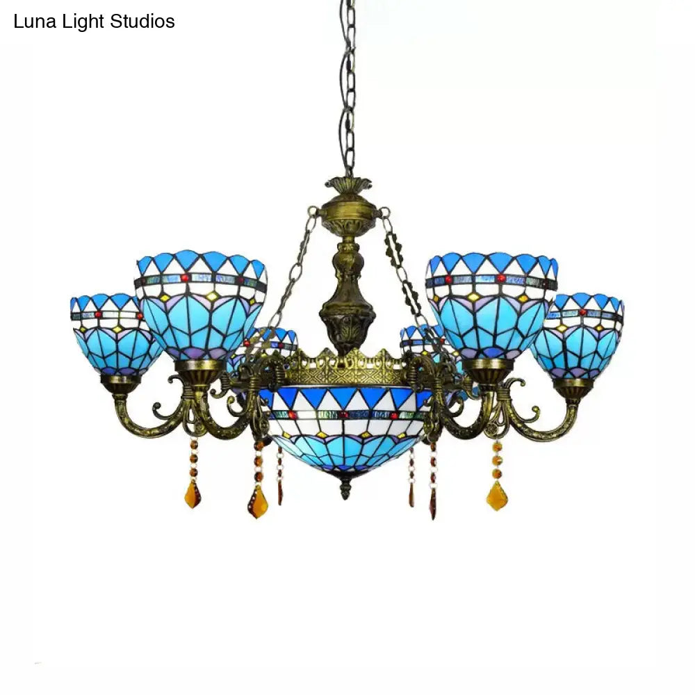 Lámpara de techo Tiffany azul con cristal ámbar y detalles de joyas para el techo del comedor
