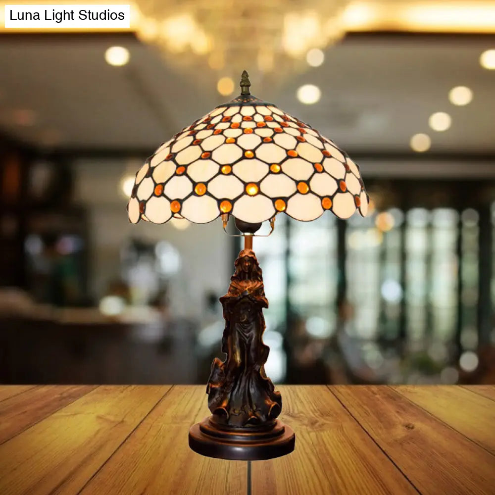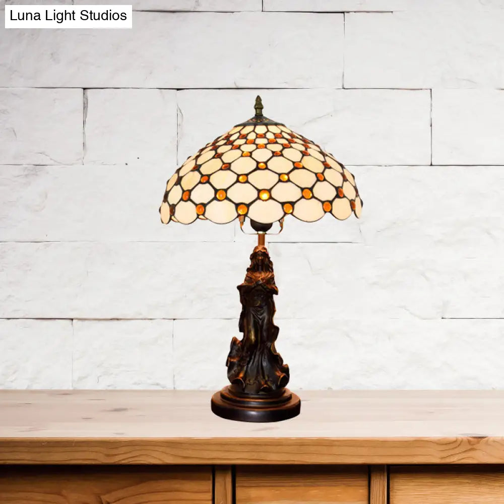 Asellus Secundus - Lámpara de mesa Tiffany de 1 luz con decoración de ángel y cabujones. Luz nocturna con rejilla.