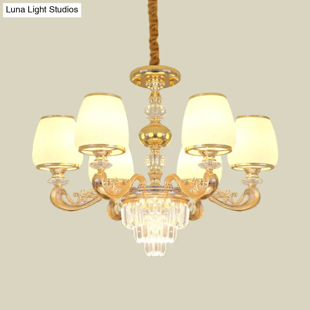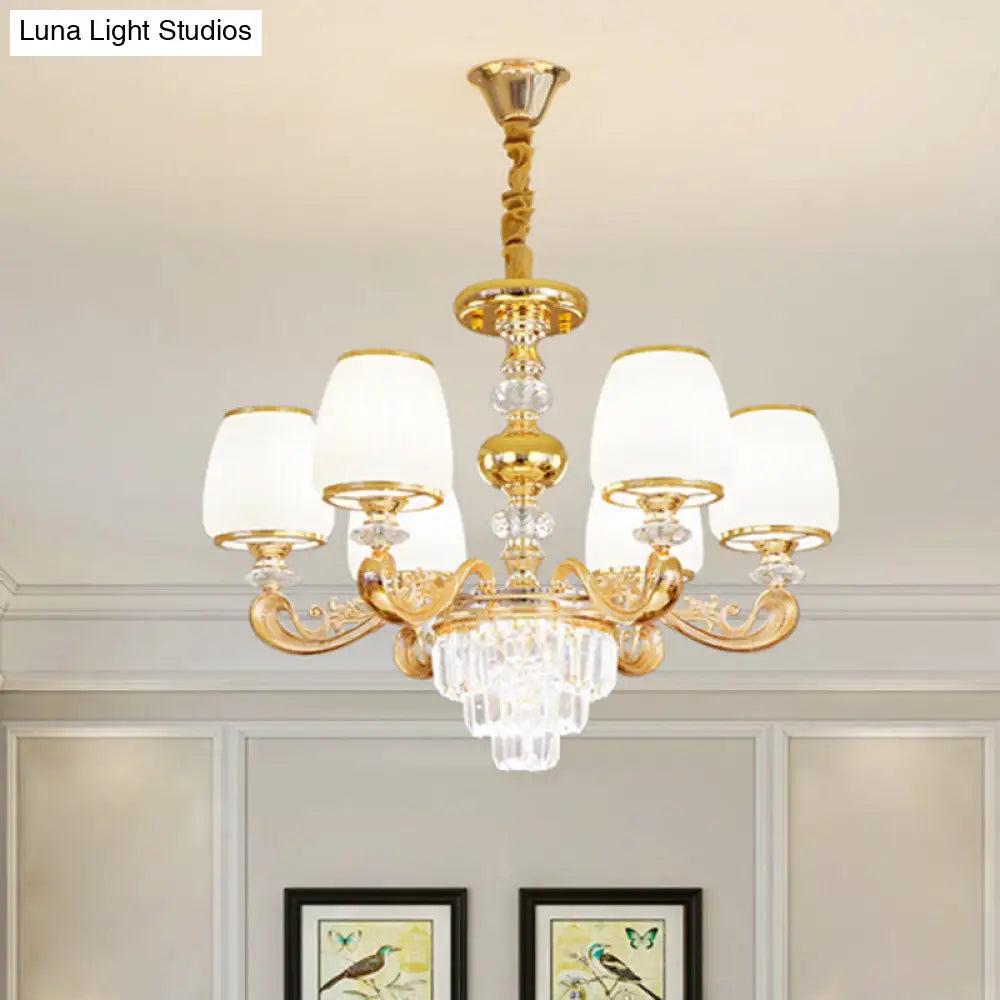 Lámpara de techo moderna con brazos tallados para dormitorio: cristal opalino, 6 bombillas, lámpara colgante de cristal dorado