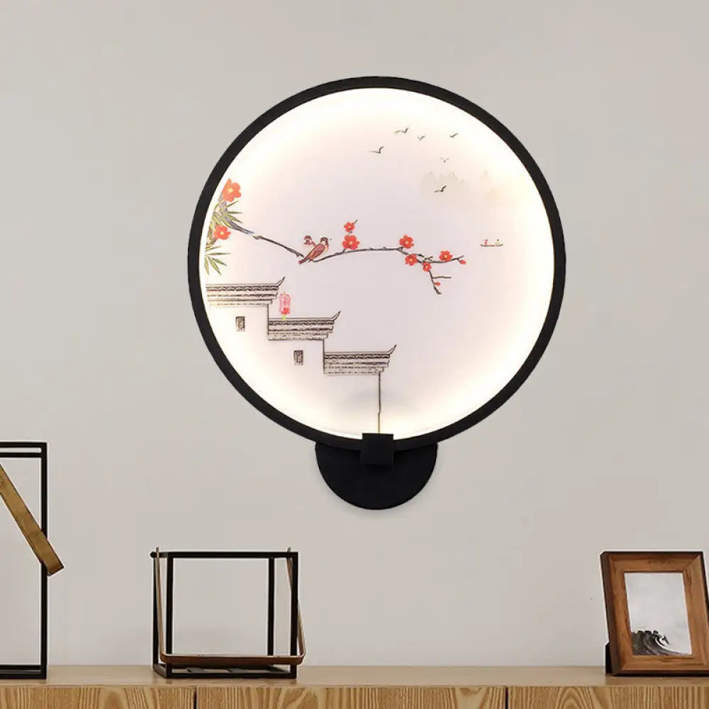 Aplique de pared LED circular con mural de tinta china/loto en negro - Lámpara de dormitorio acrílica