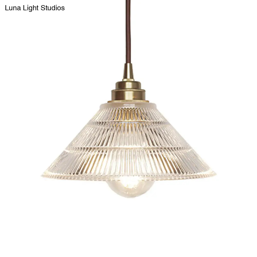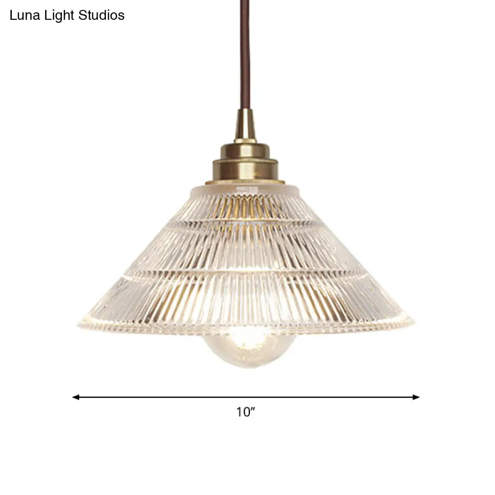Lámpara colgante cónica de cristal transparente acanalado: Lámpara minimalista de una luz en latón para mesa de comedor