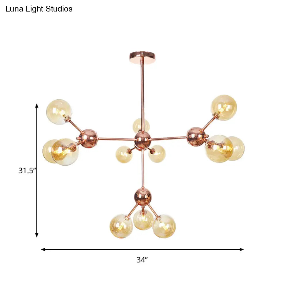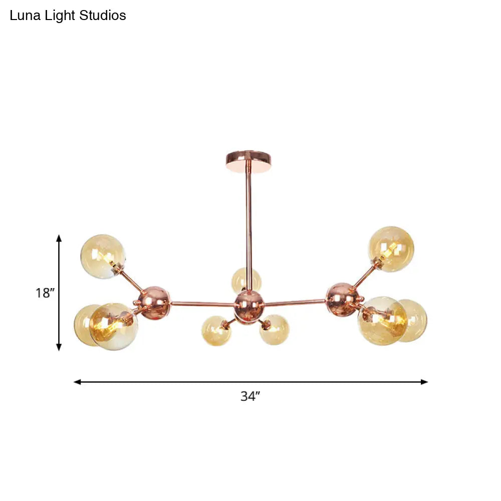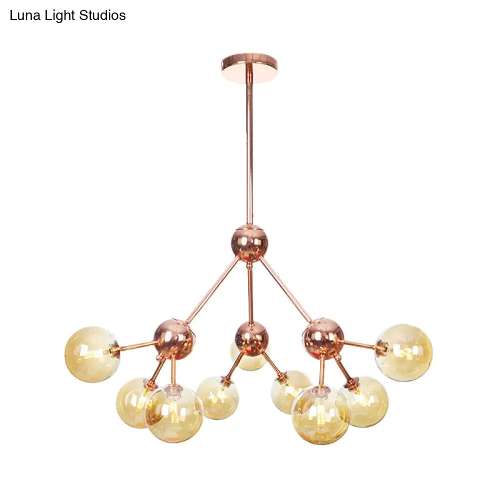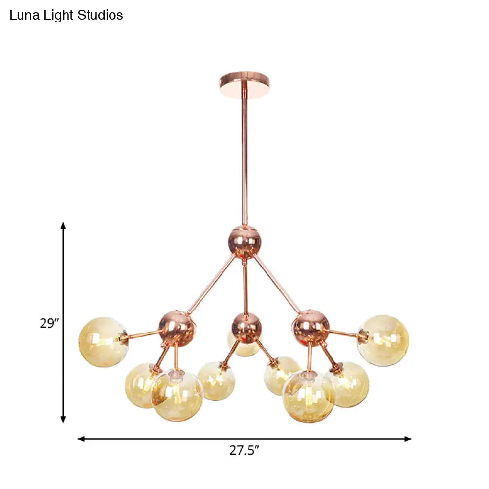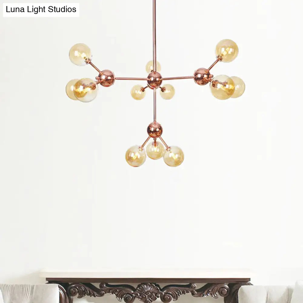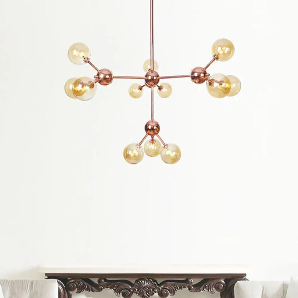 Lámpara de araña vintage de cobre con pantallas esféricas de cristal transparente/ámbar - 3/9/12 luces, diseño de ramas - 33/70/86 cm de ancho