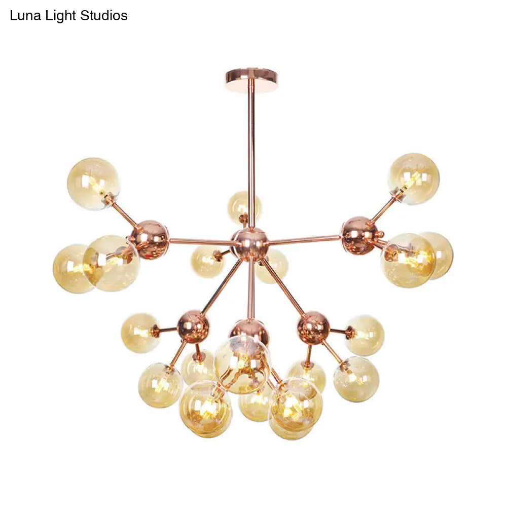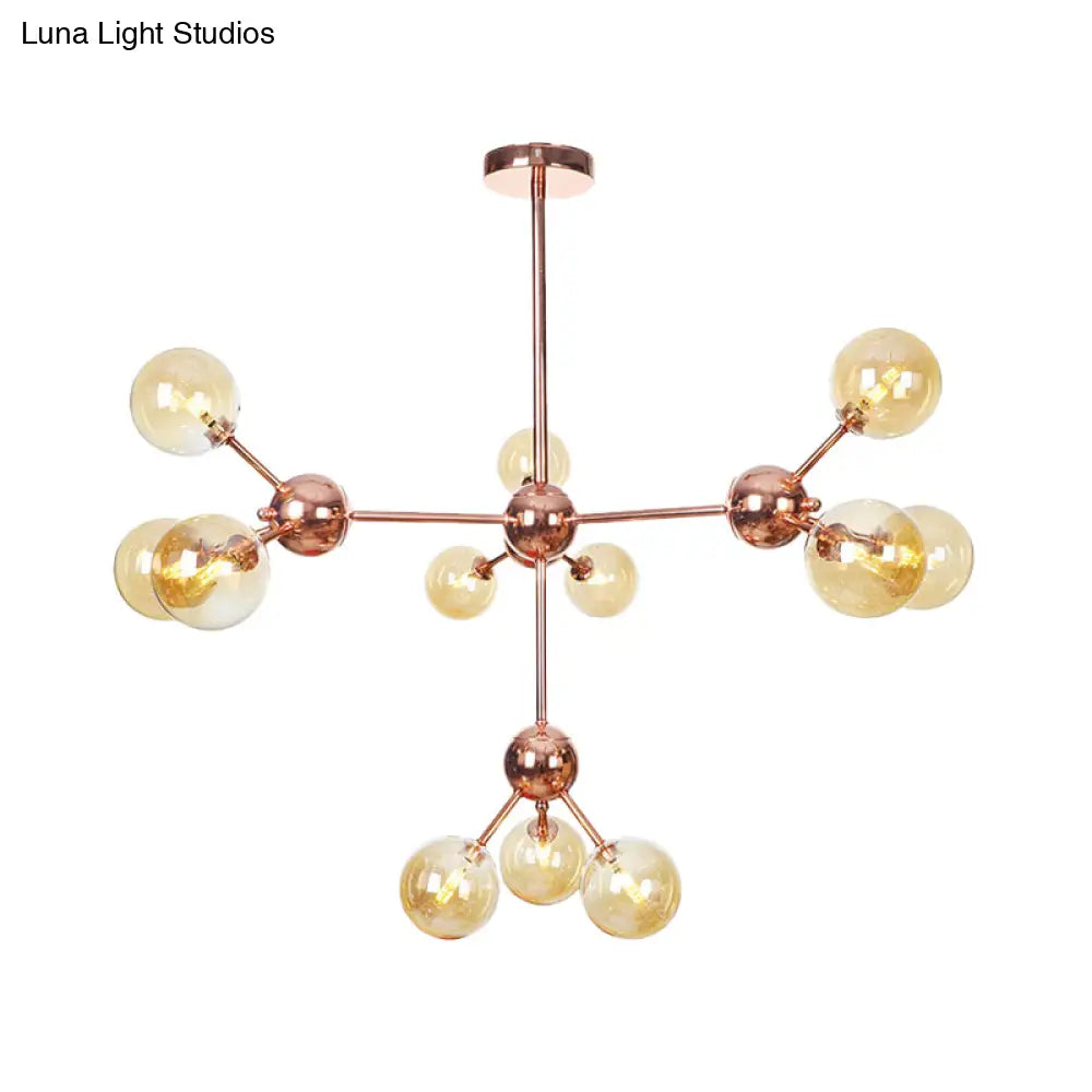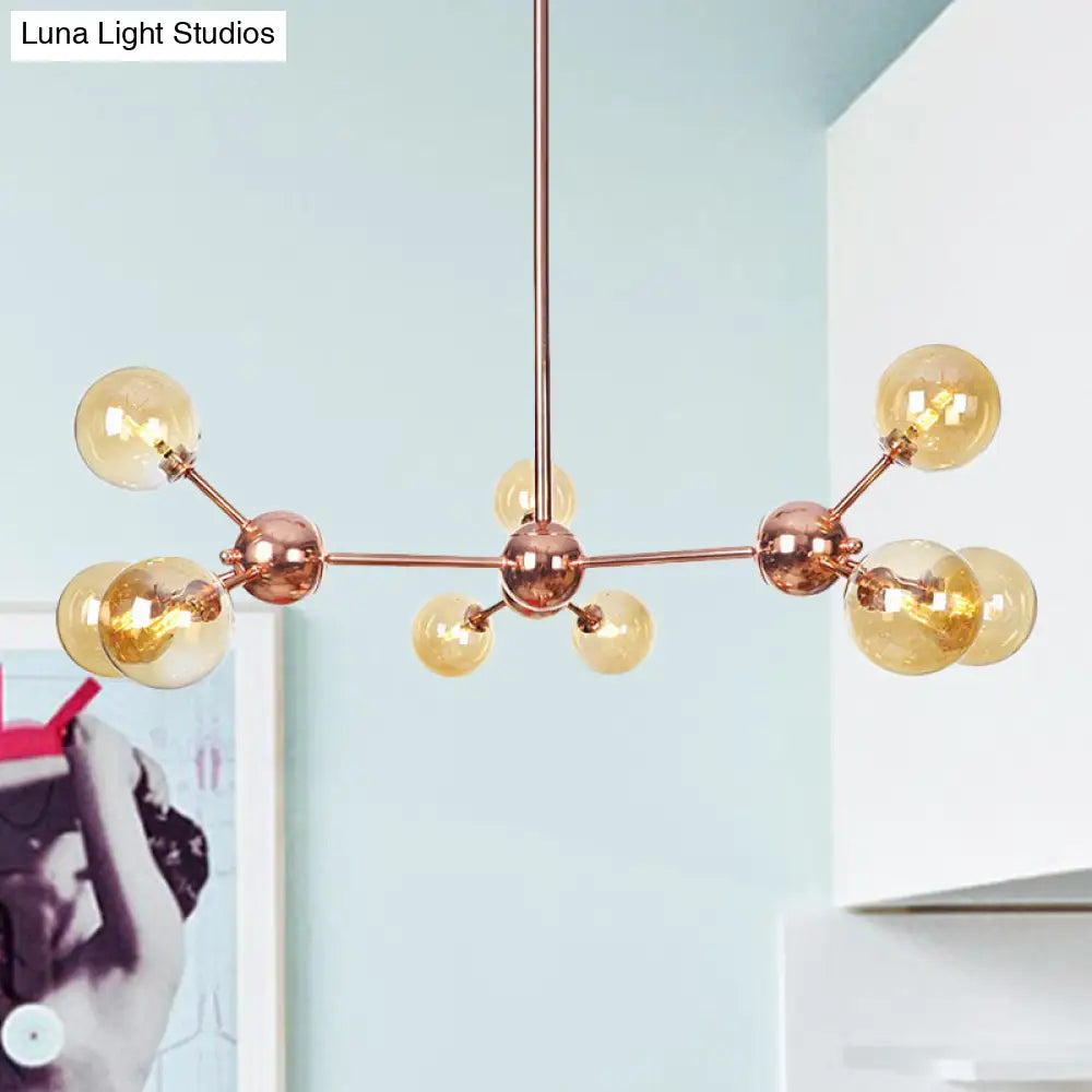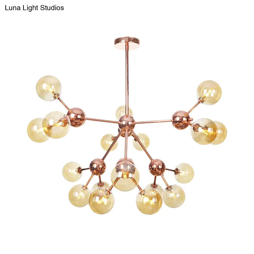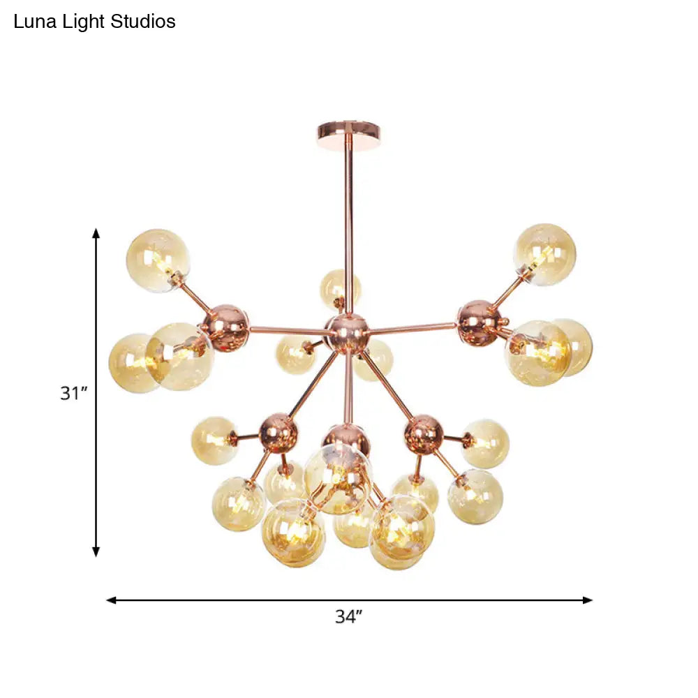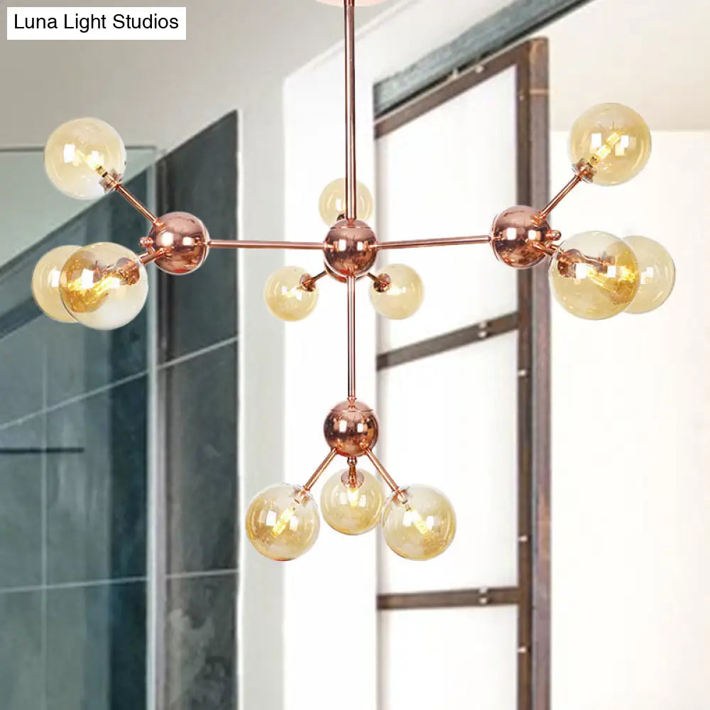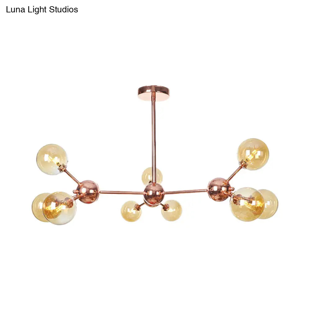 Lámpara de araña vintage de cobre con pantallas esféricas de cristal transparente/ámbar - 3/9/12 luces, diseño de ramas - 33/70/86 cm de ancho