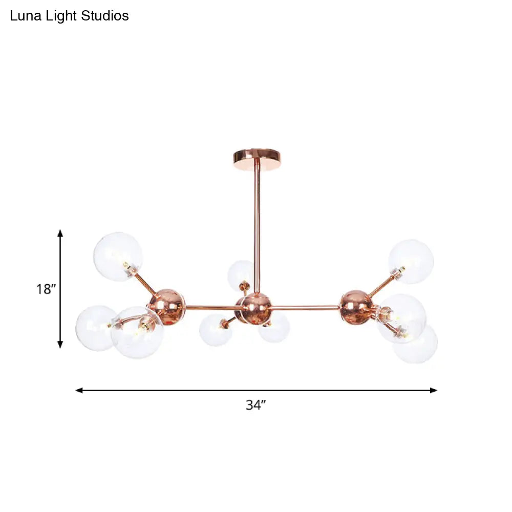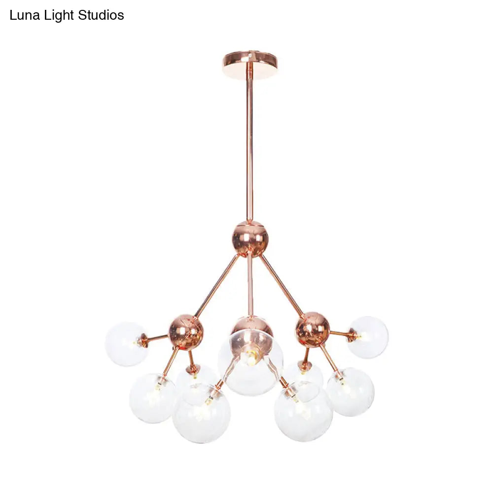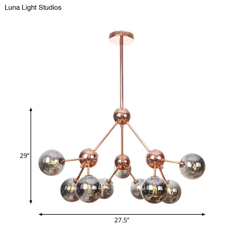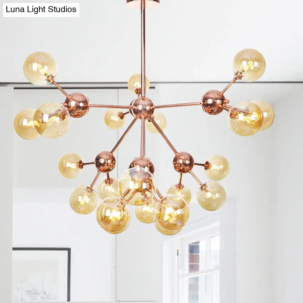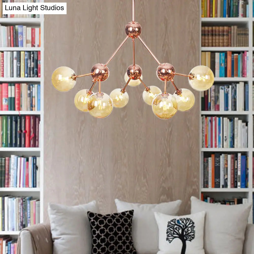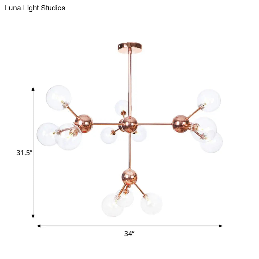 Lámpara de araña vintage de cobre con pantallas esféricas de cristal transparente/ámbar - 3/9/12 luces, diseño de ramas - 33/70/86 cm de ancho