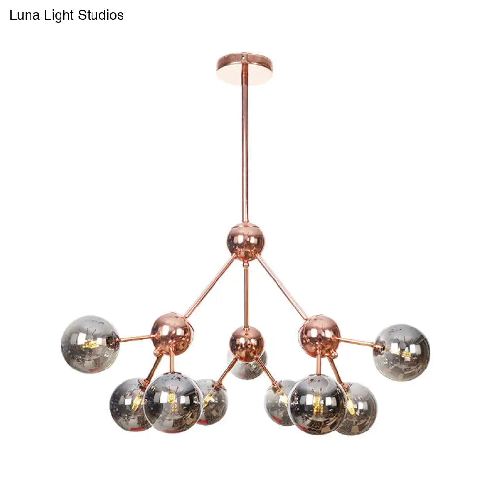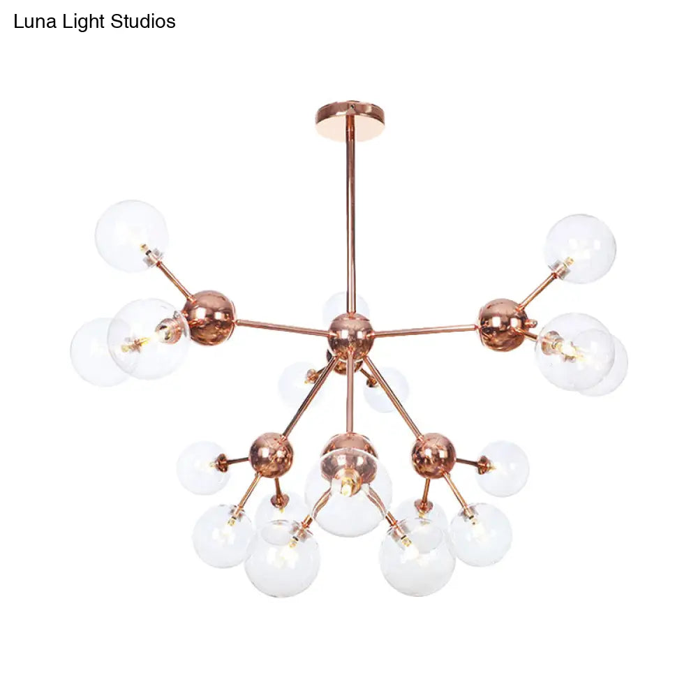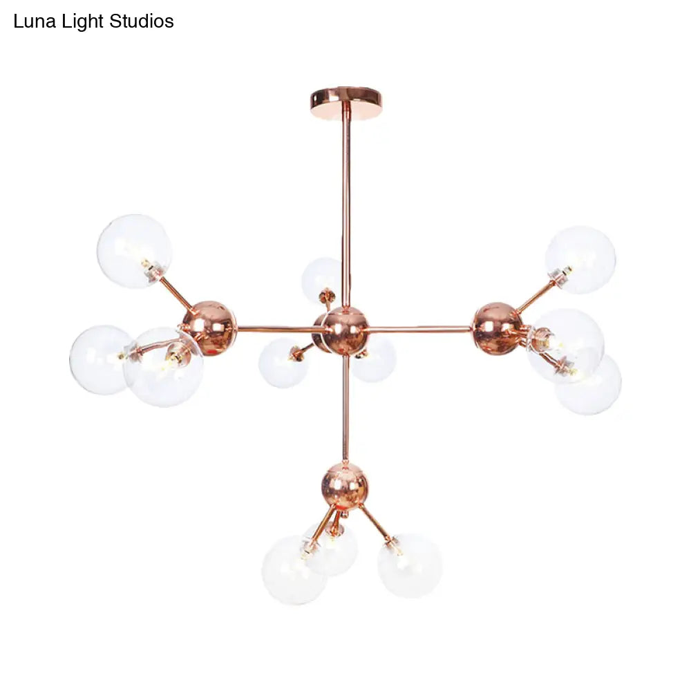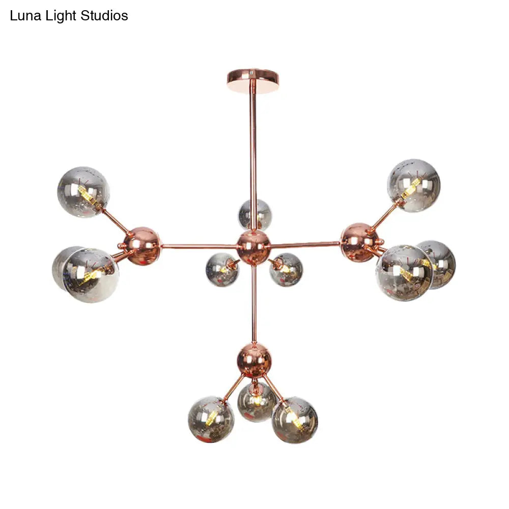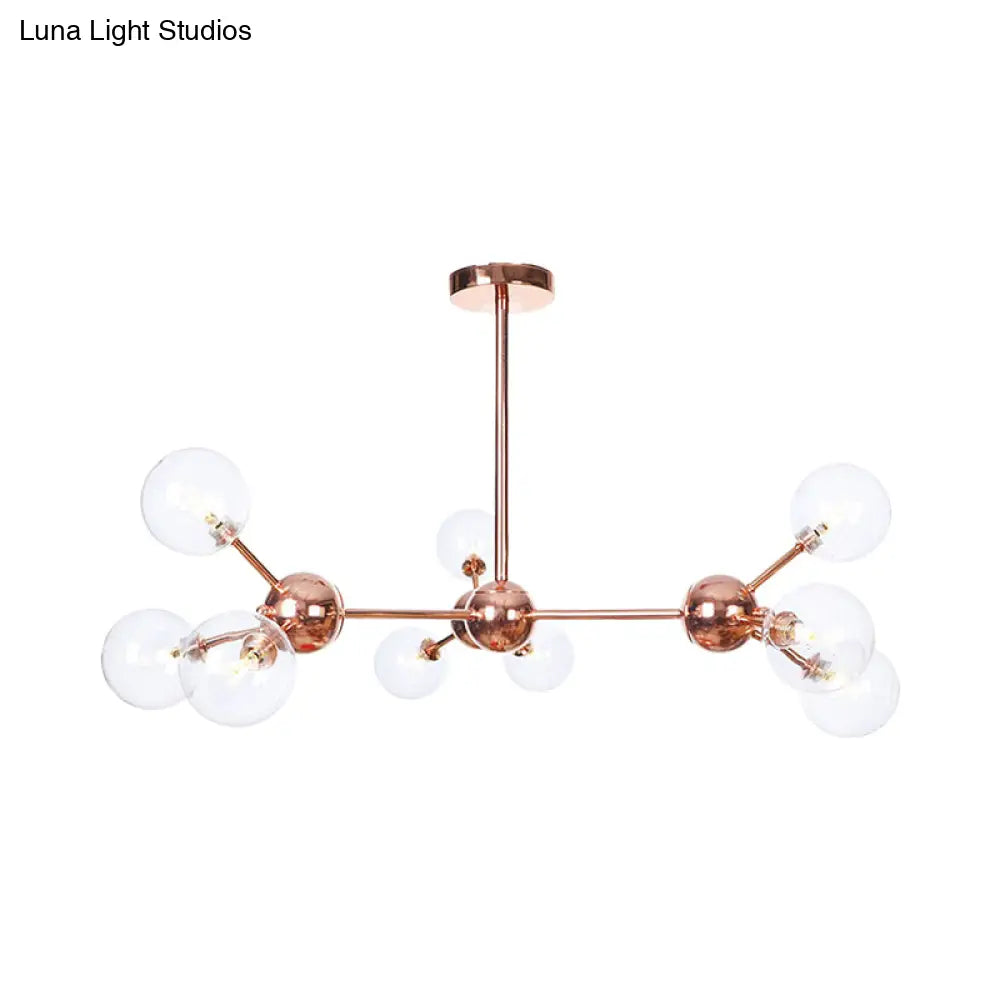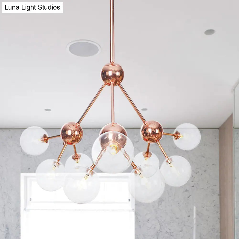 Lámpara de araña vintage de cobre con pantallas esféricas de cristal transparente/ámbar - 3/9/12 luces, diseño de ramas - 33/70/86 cm de ancho