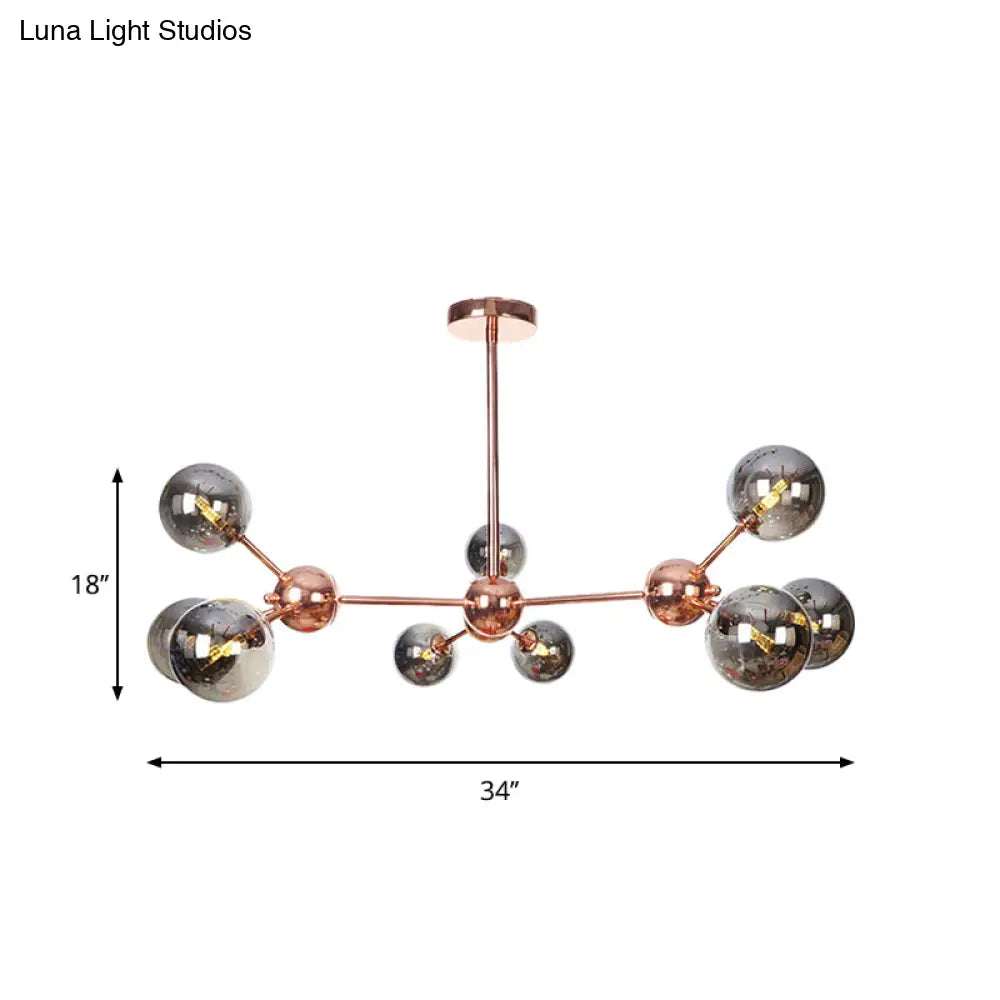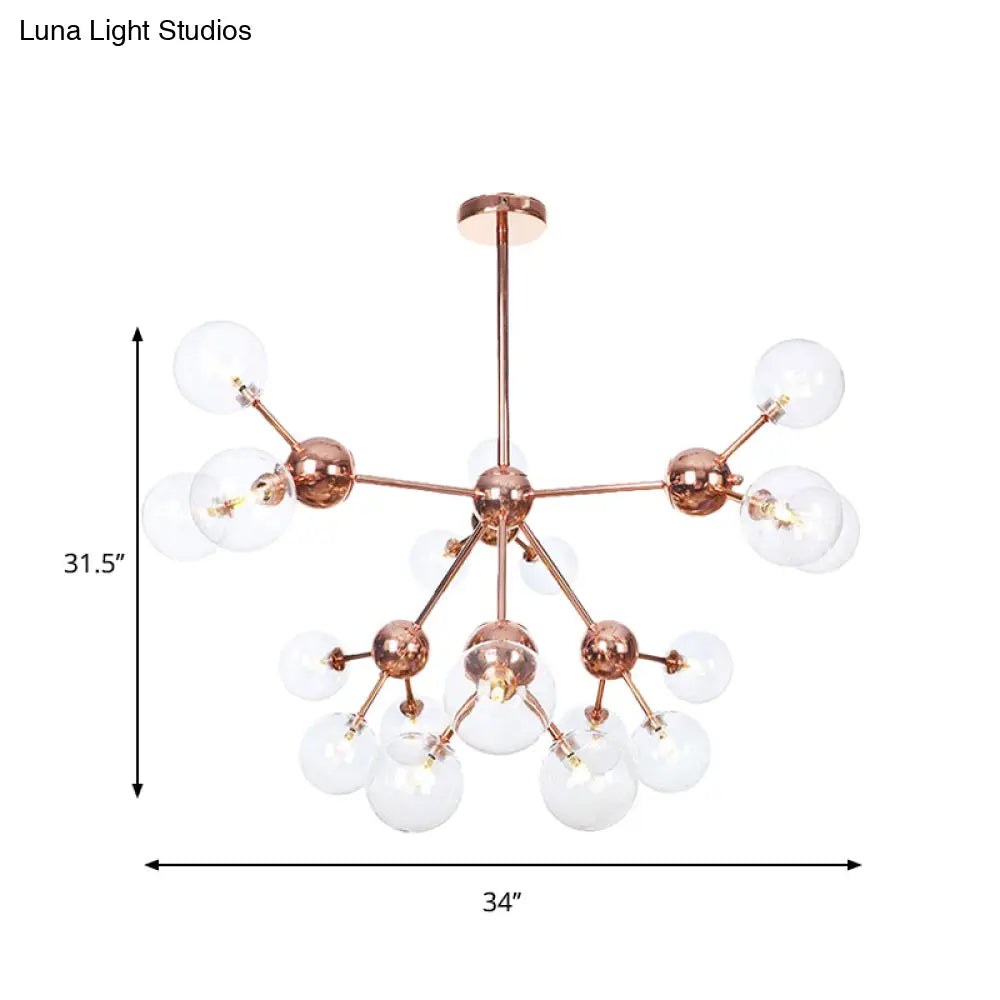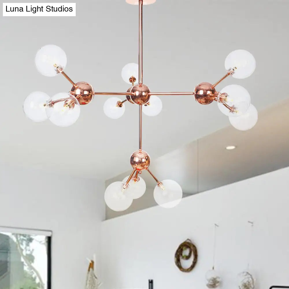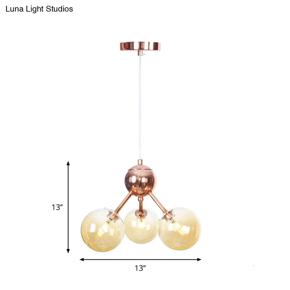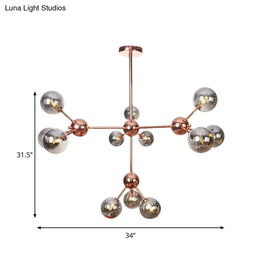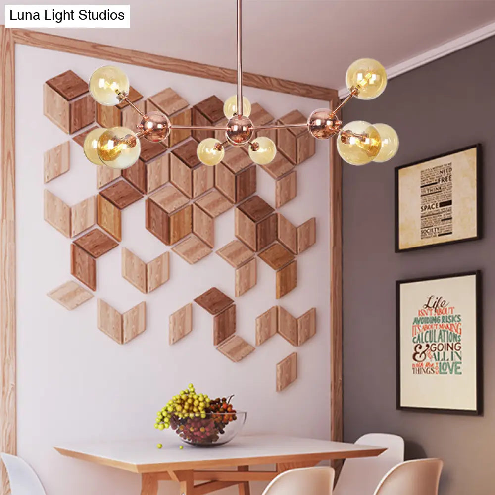 Lámpara de araña vintage de cobre con pantallas esféricas de cristal transparente/ámbar - 3/9/12 luces, diseño de ramas - 33/70/86 cm de ancho