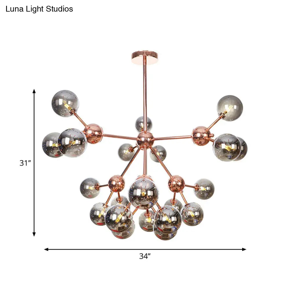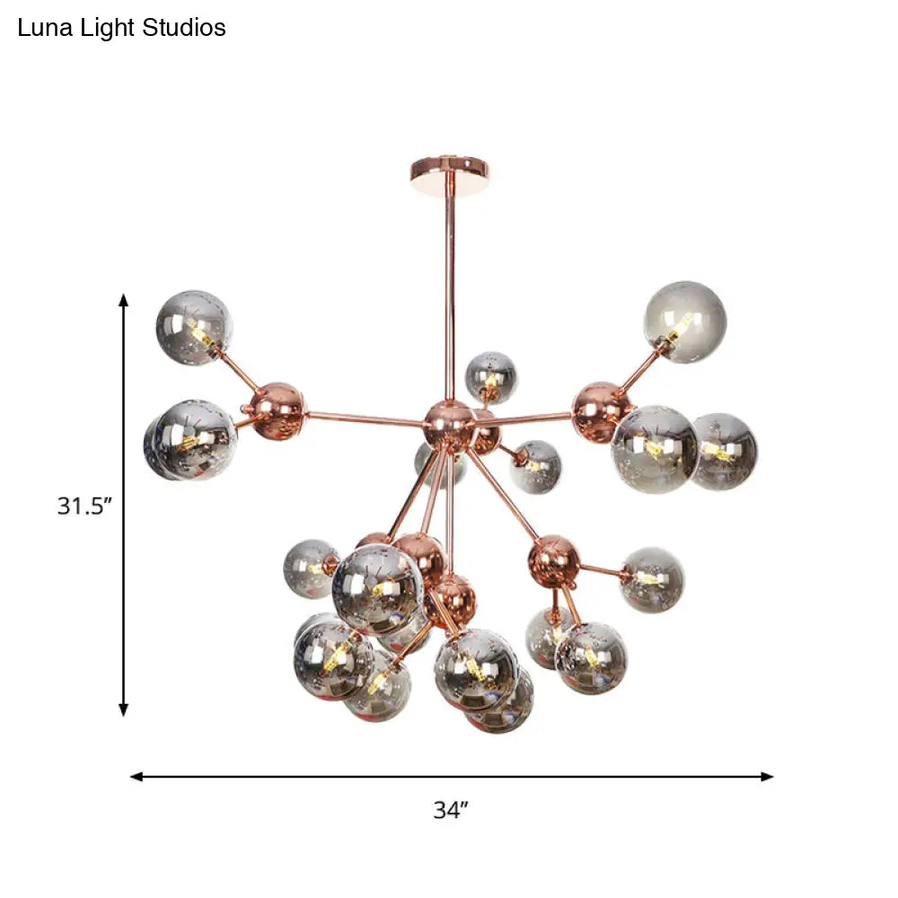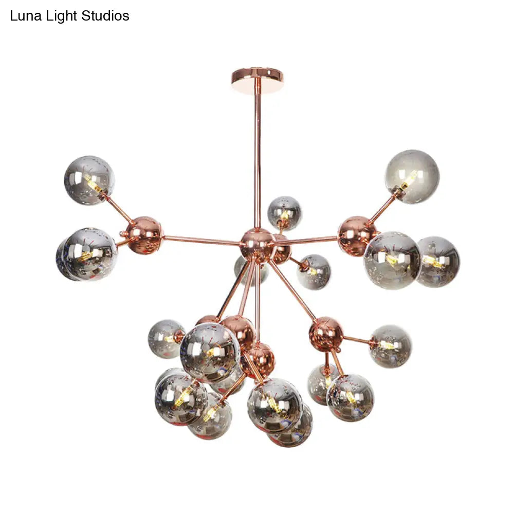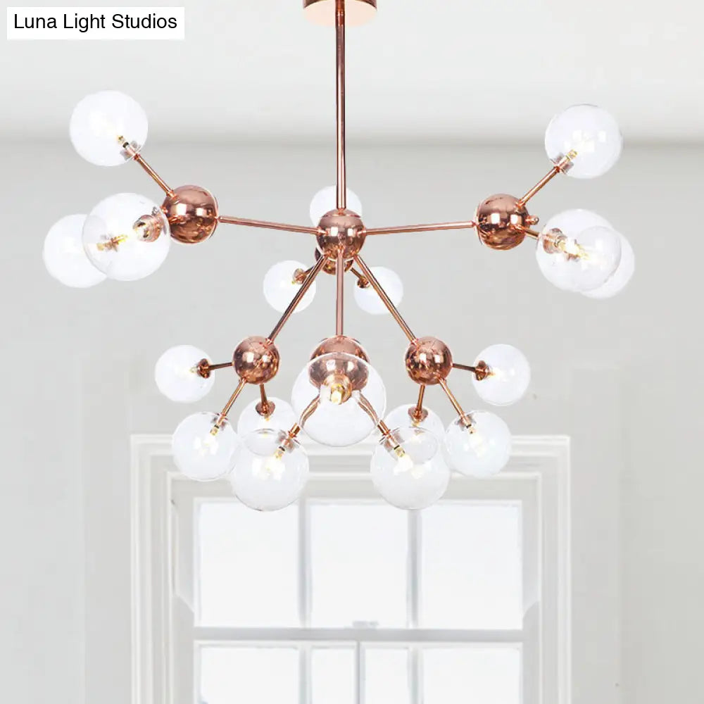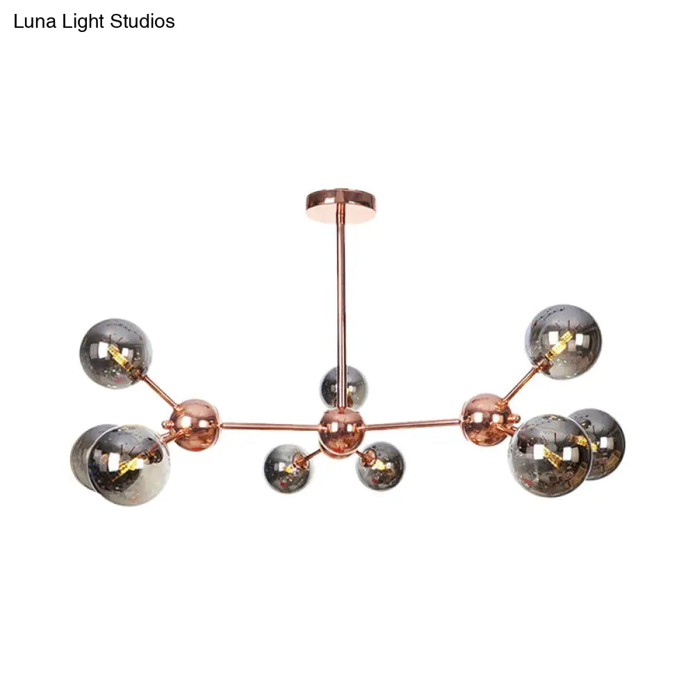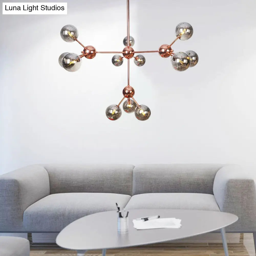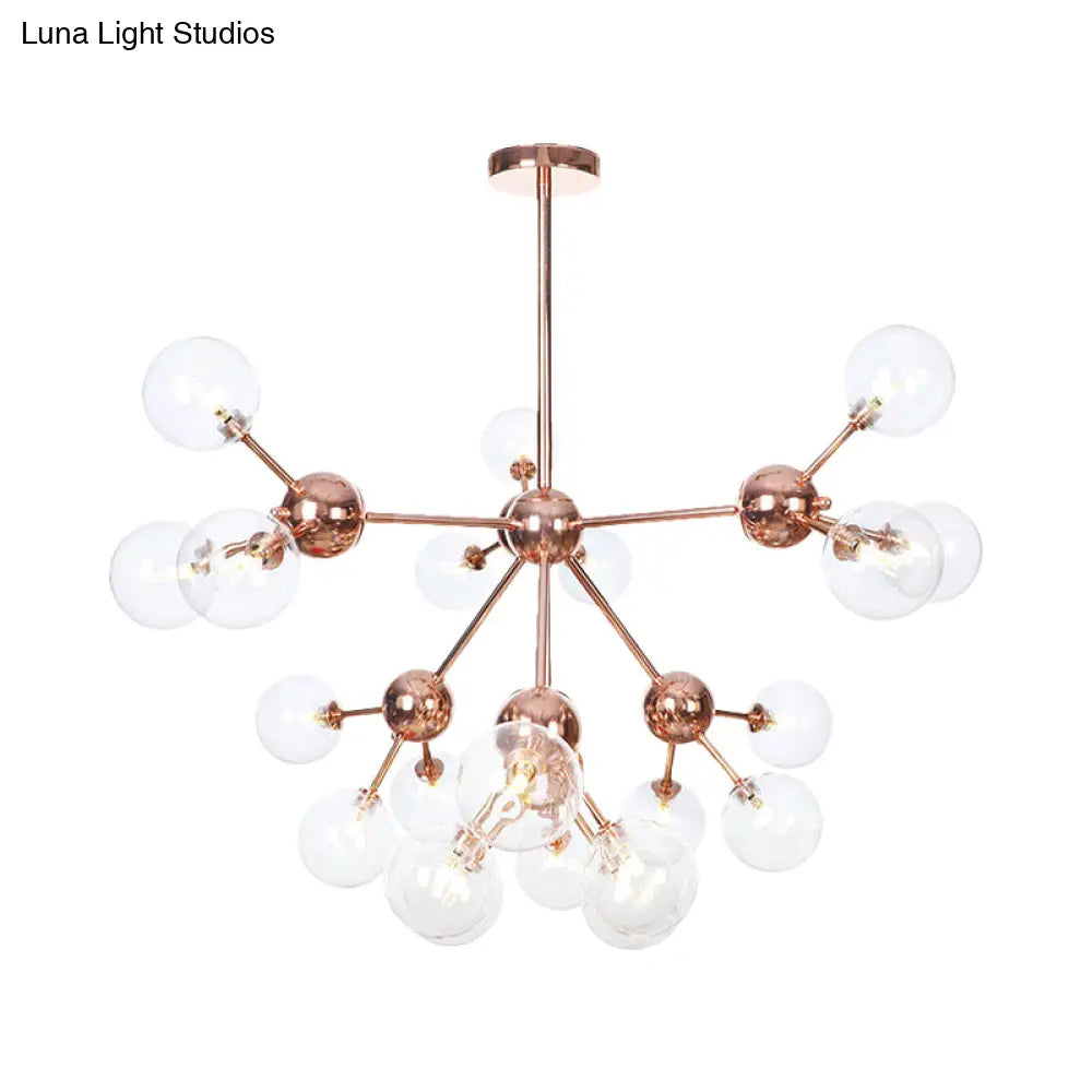 Lámpara de araña vintage de cobre con pantallas esféricas de cristal transparente/ámbar - 3/9/12 luces, diseño de ramas - 33/70/86 cm de ancho