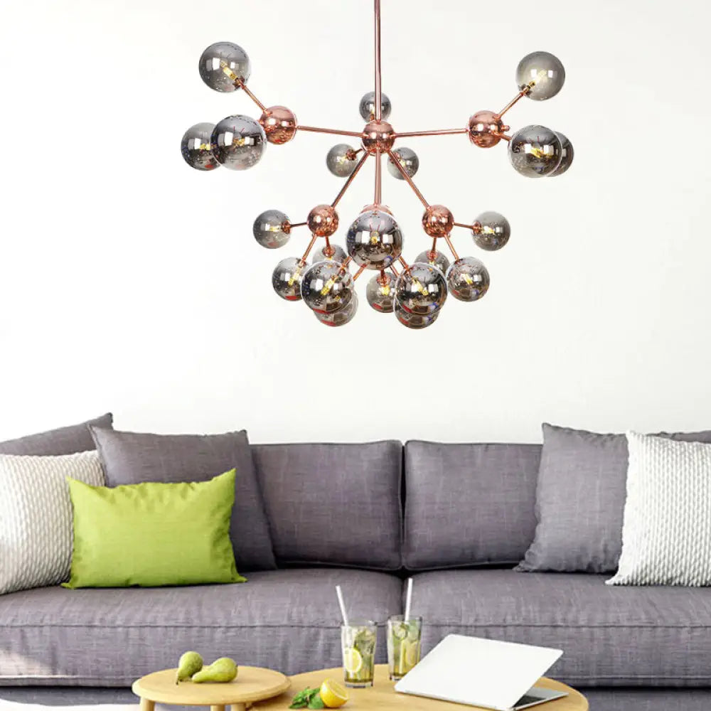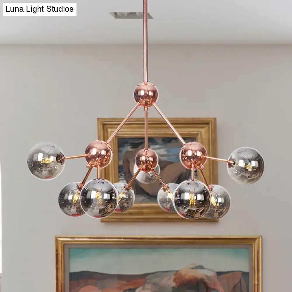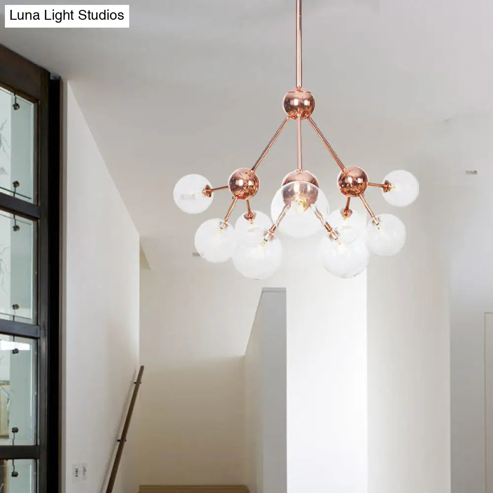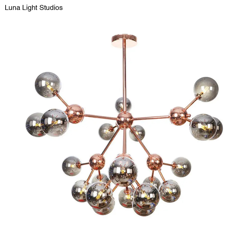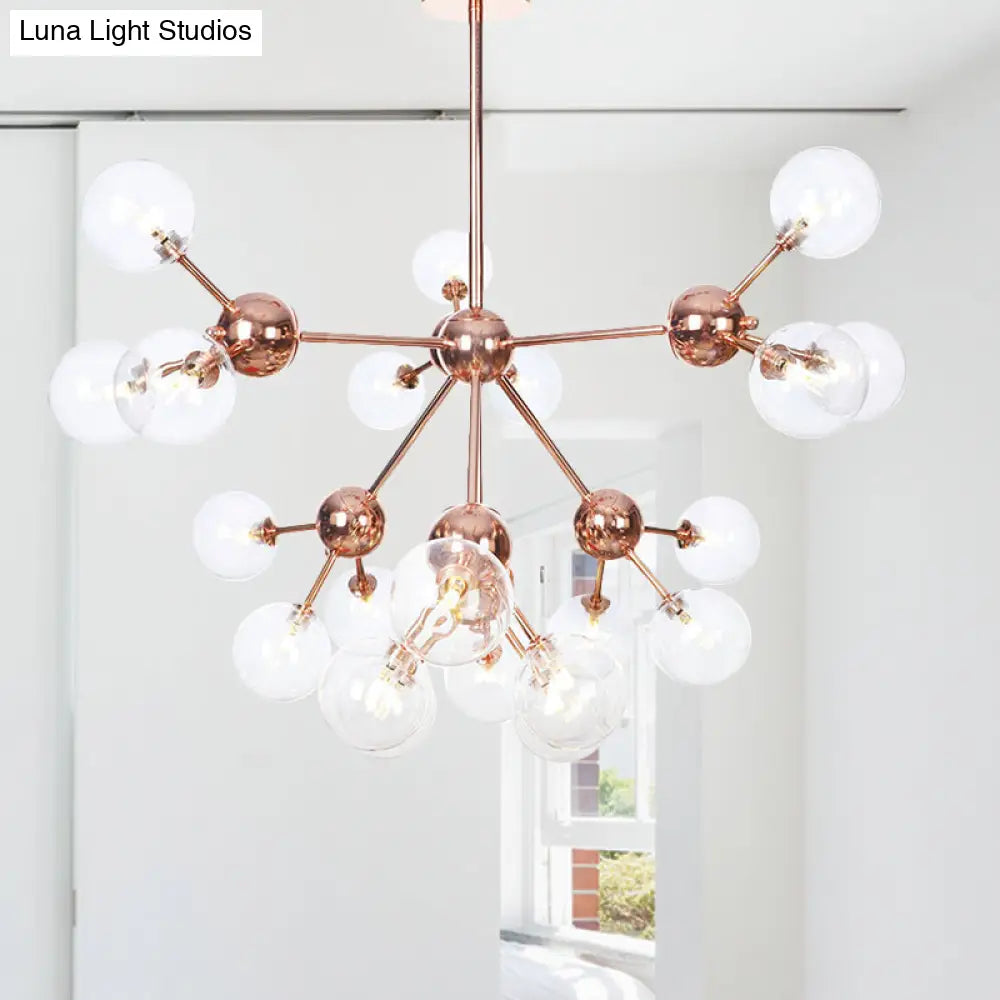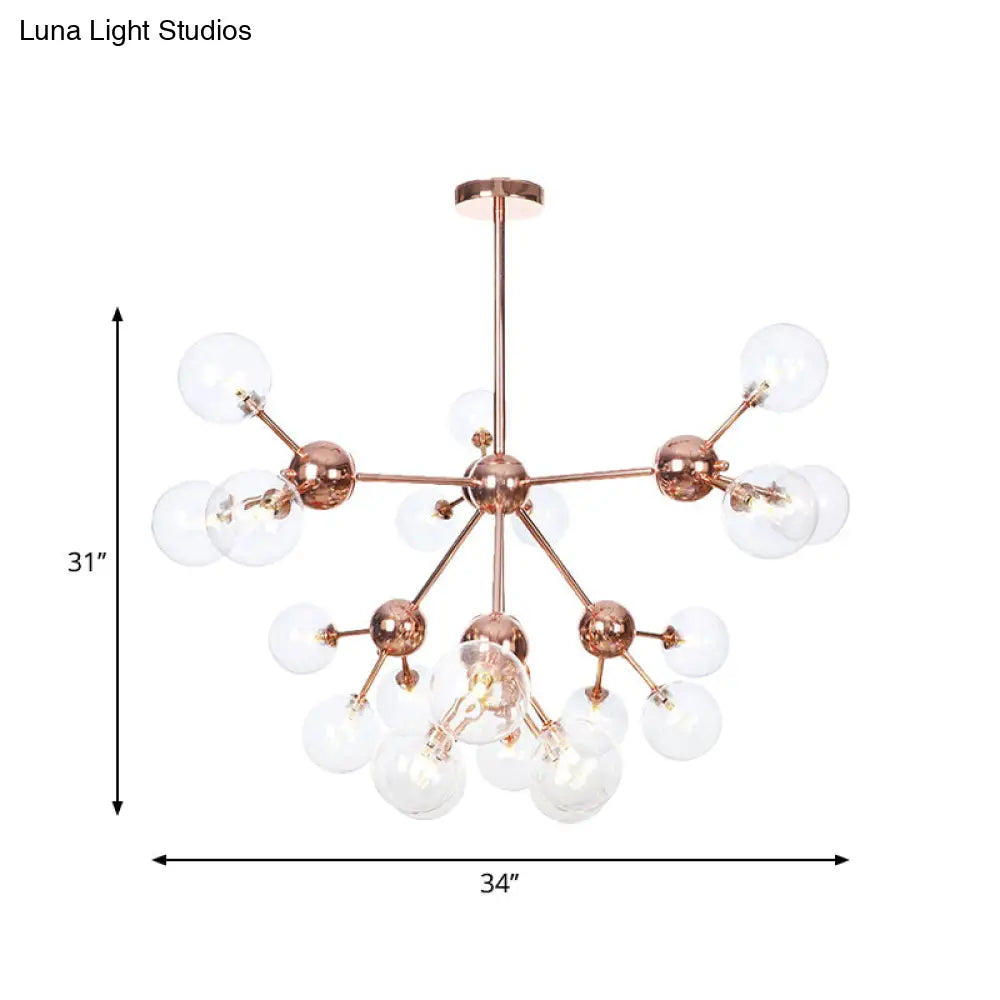 Lámpara de araña vintage de cobre con pantallas esféricas de cristal transparente/ámbar - 3/9/12 luces, diseño de ramas - 33/70/86 cm de ancho