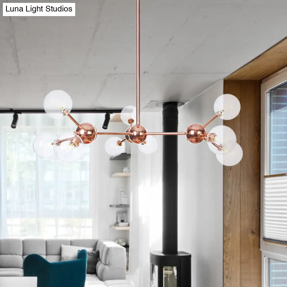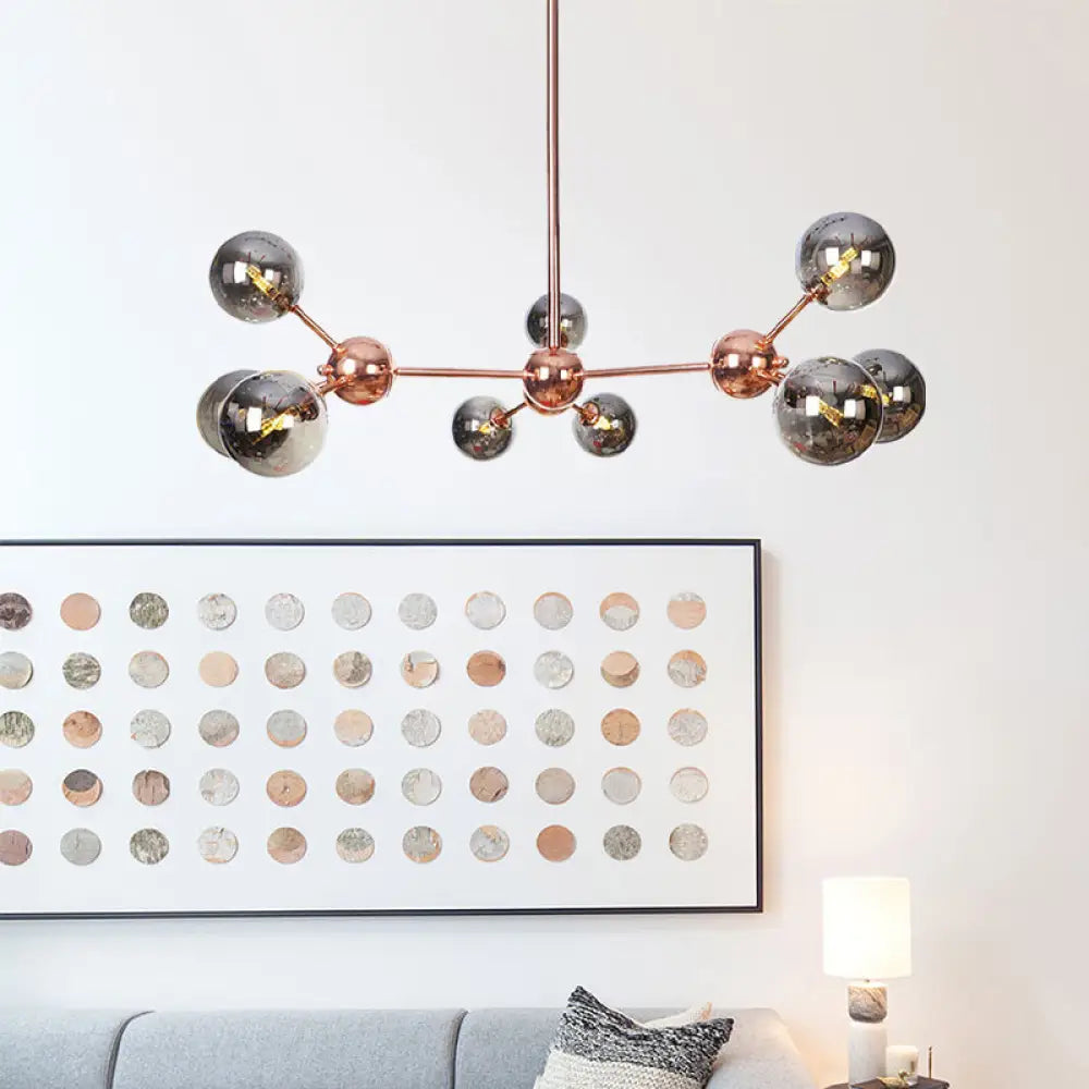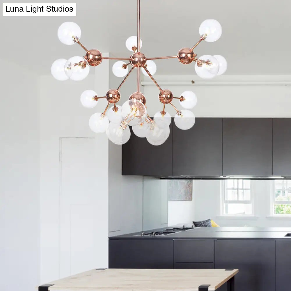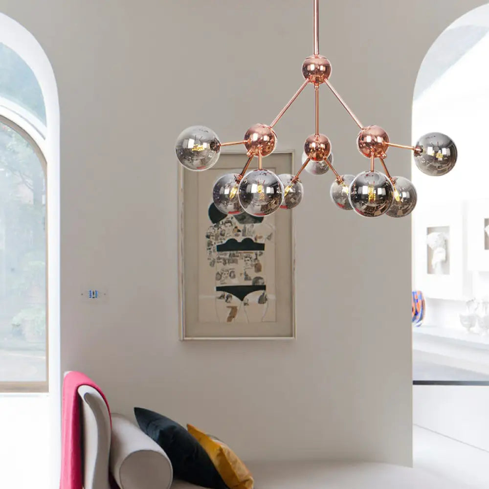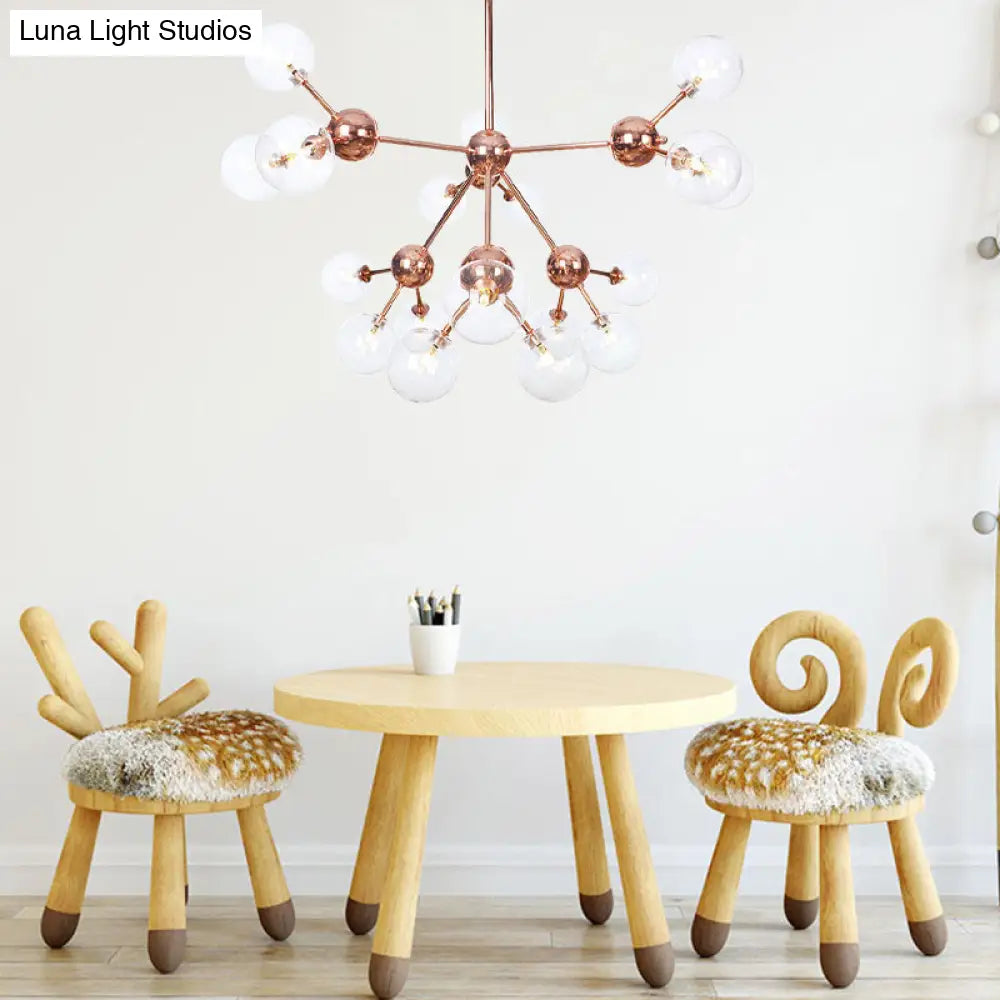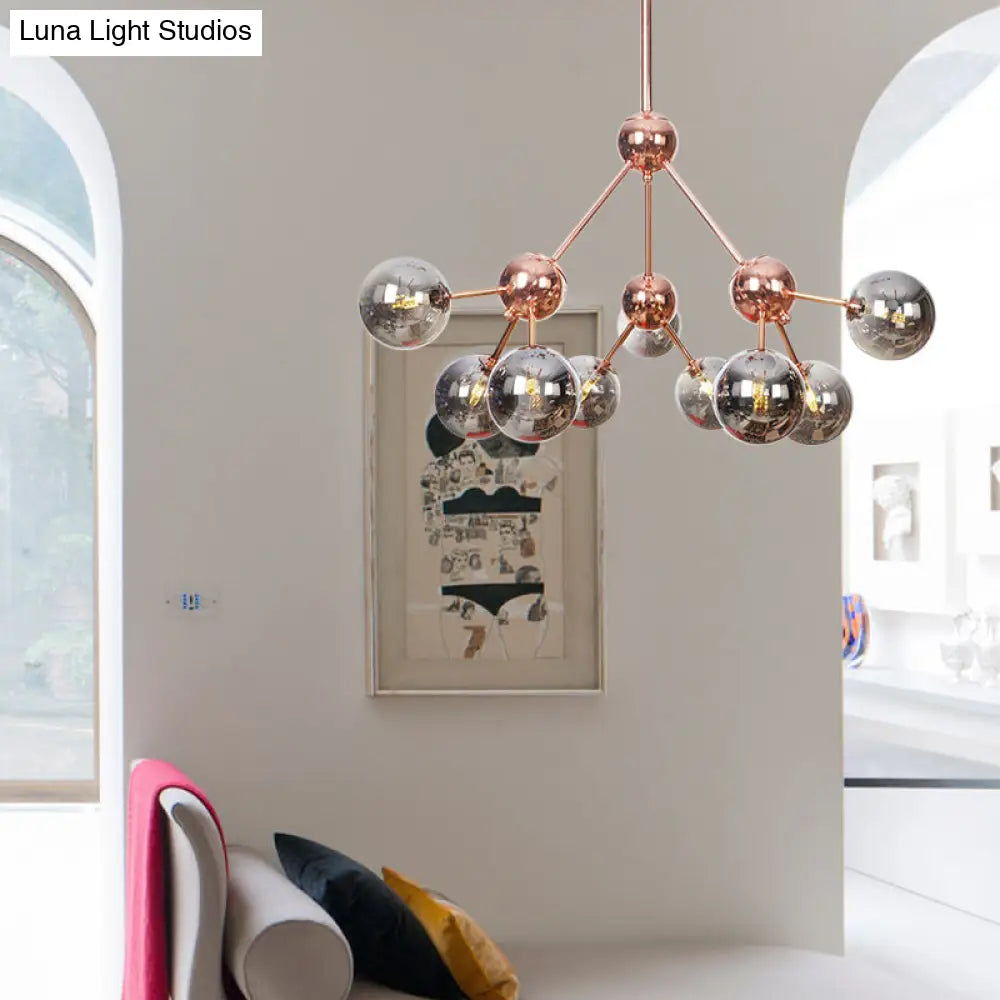Lámpara de araña vintage de cobre con pantallas esféricas de cristal transparente/ámbar - 3/9/12 luces, diseño de ramas - 33/70/86 cm de ancho
