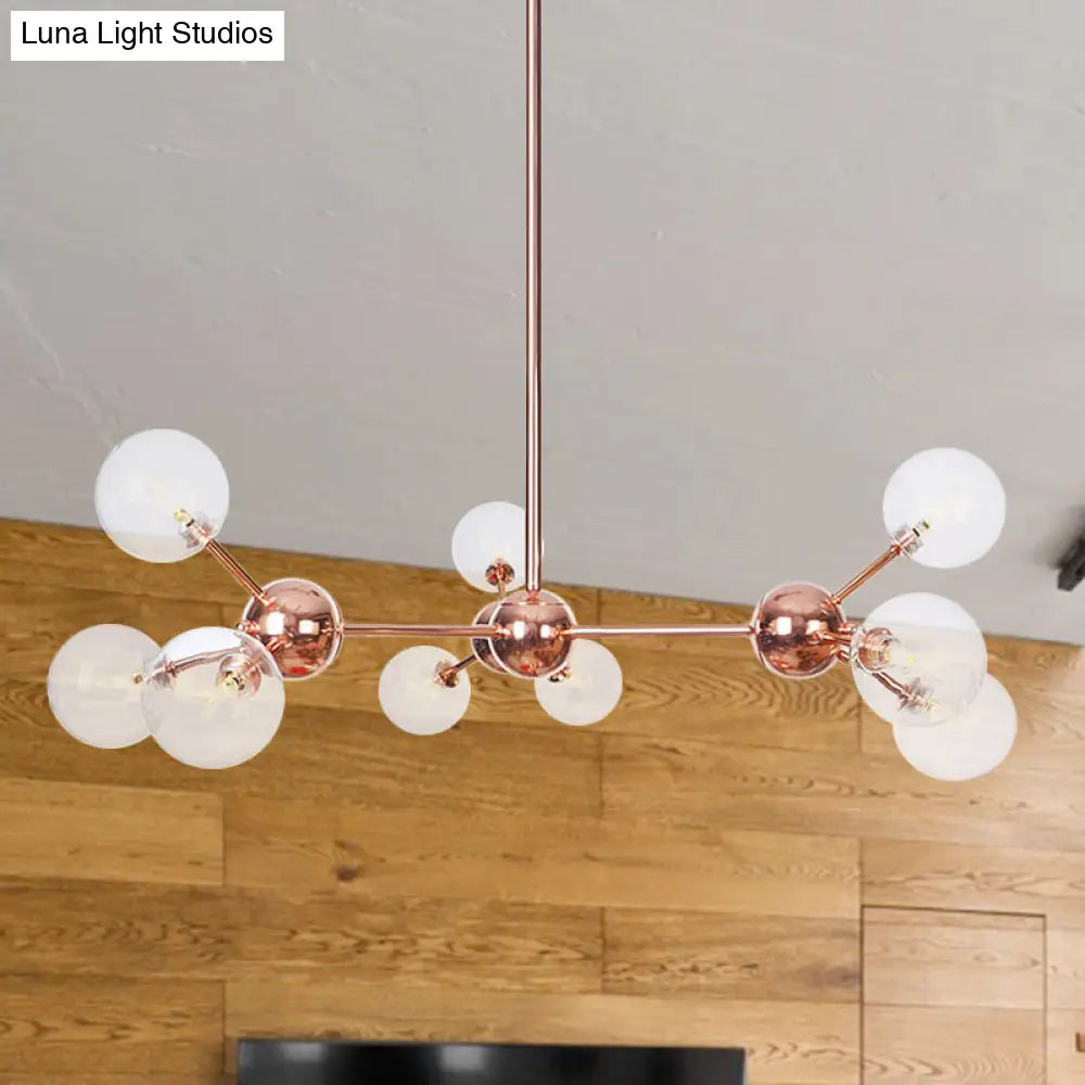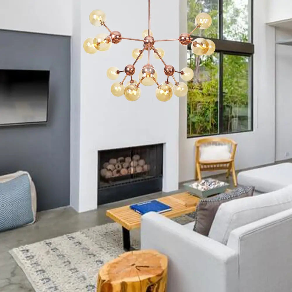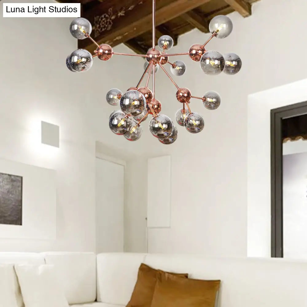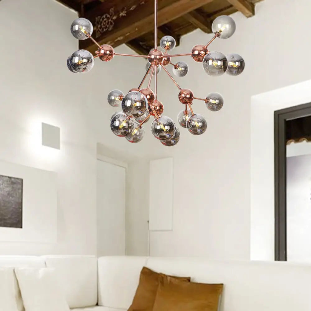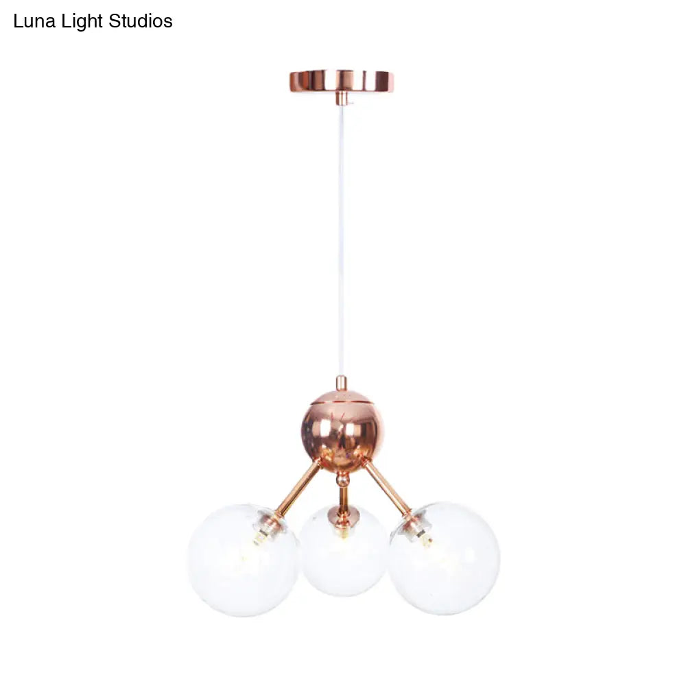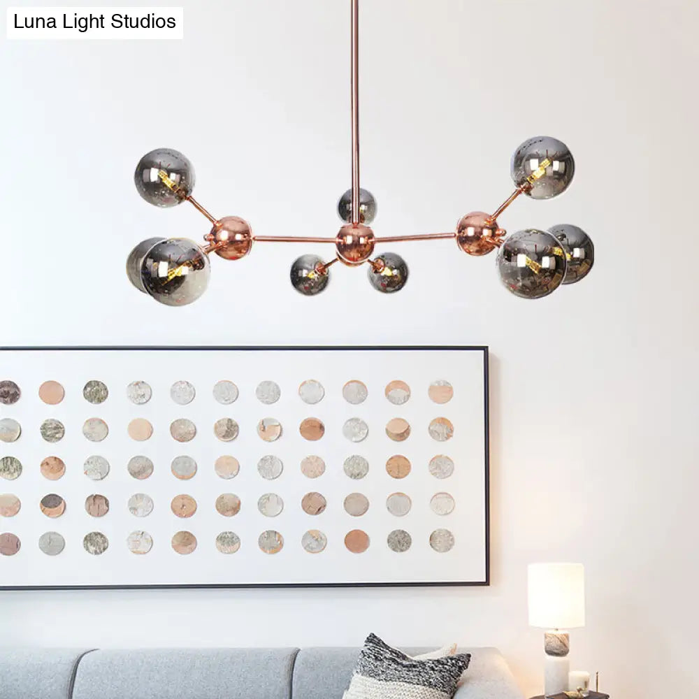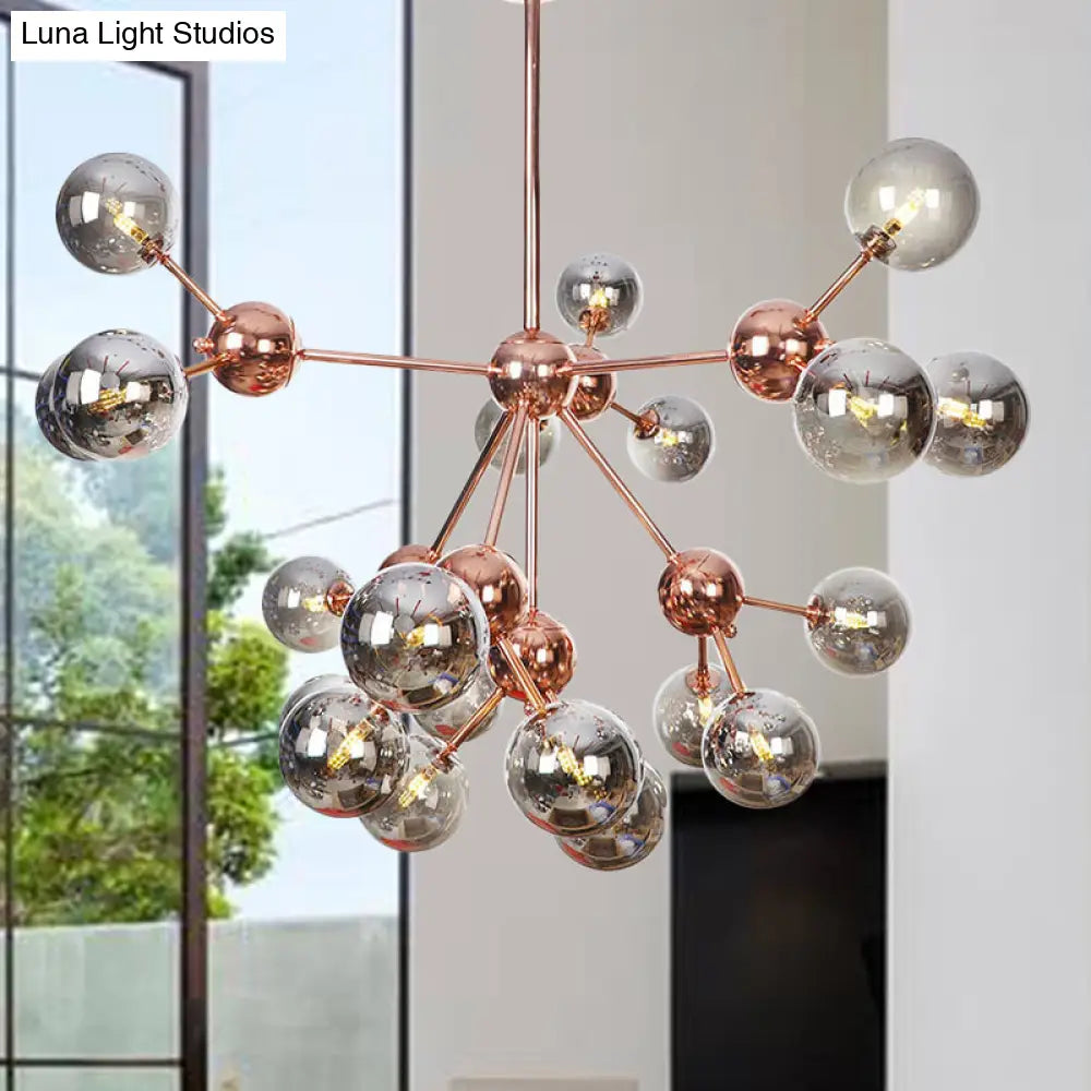 Lámpara de araña vintage de cobre con pantallas esféricas de cristal transparente/ámbar - 3/9/12 luces, diseño de ramas - 33/70/86 cm de ancho