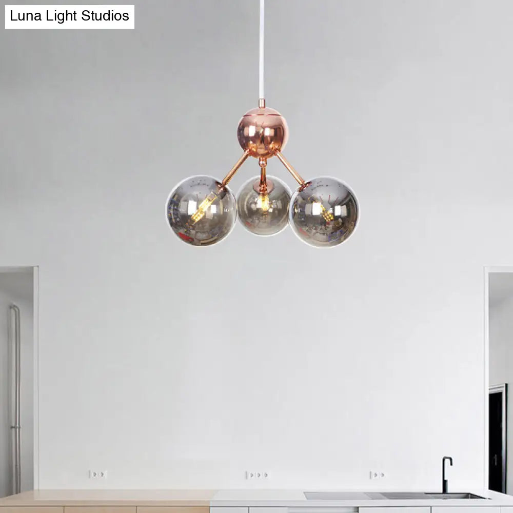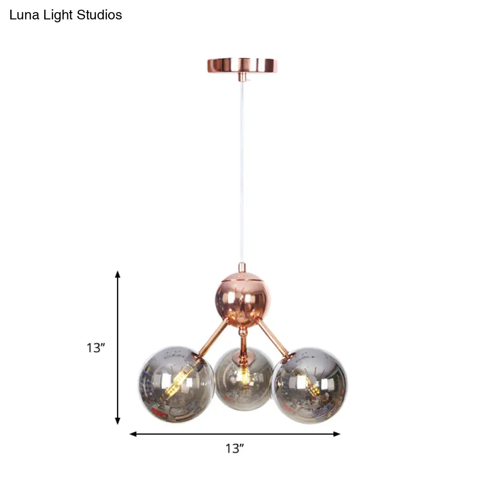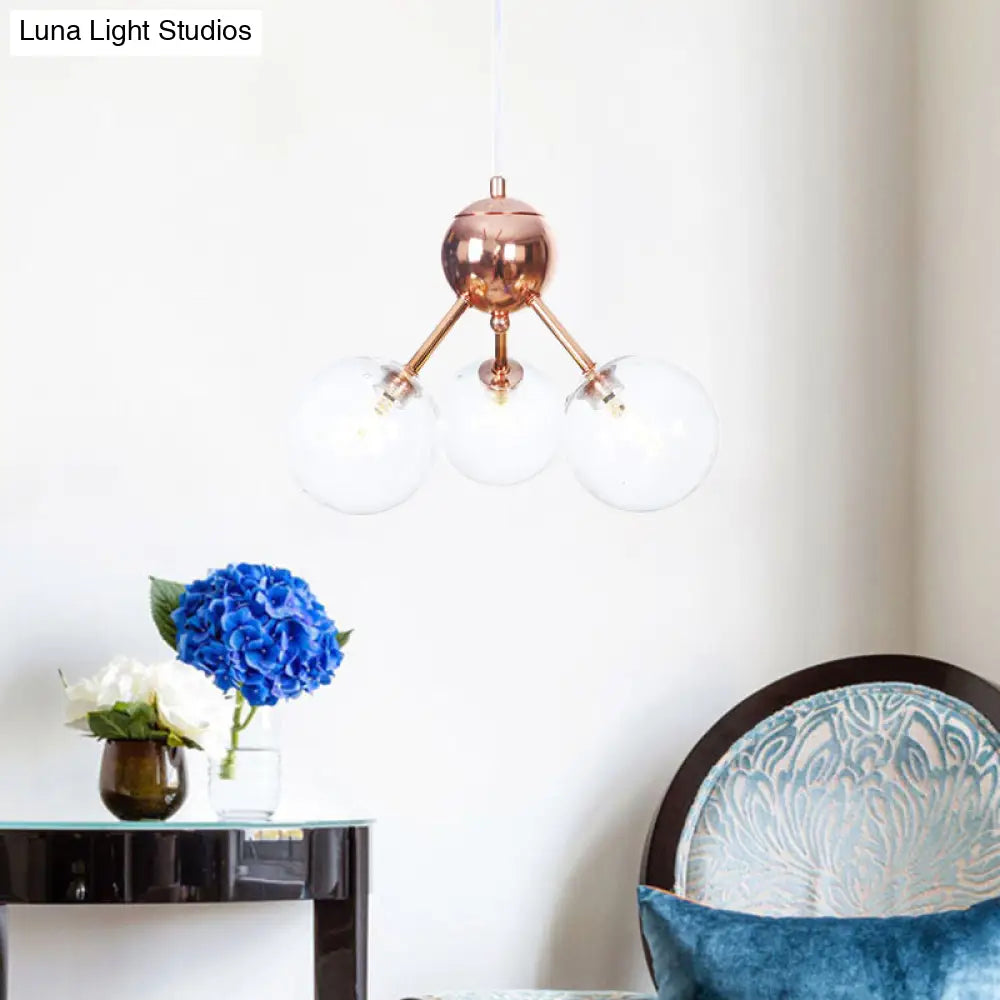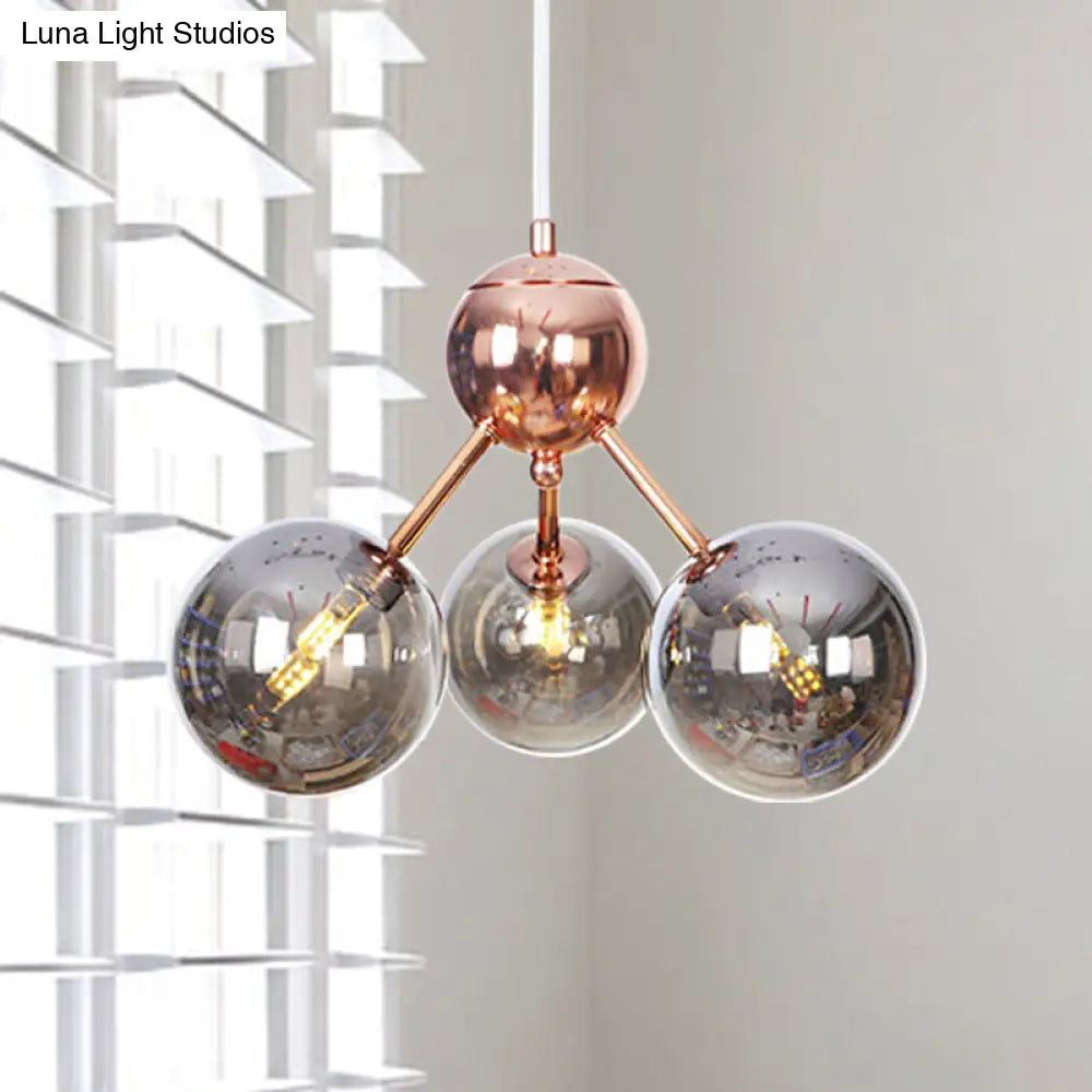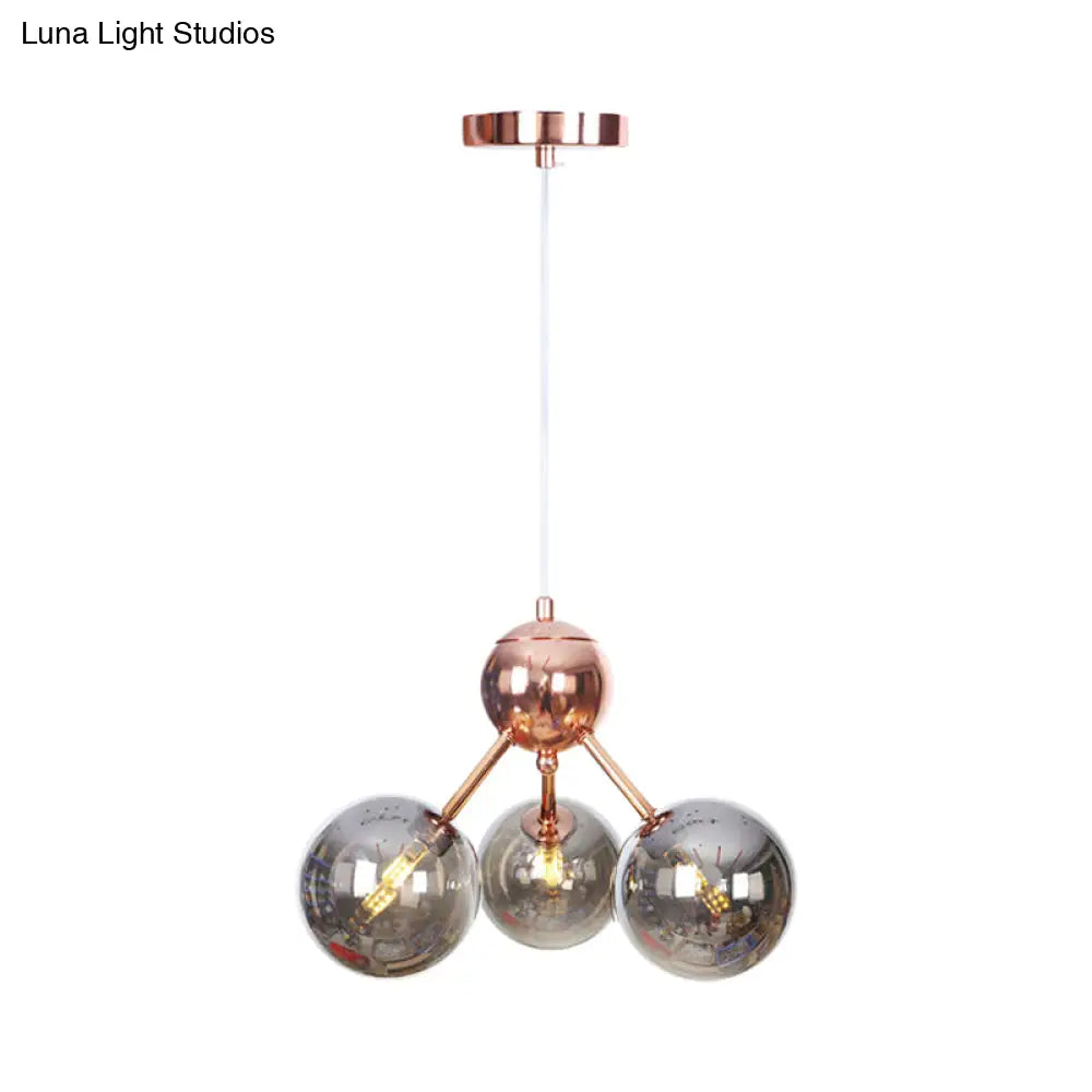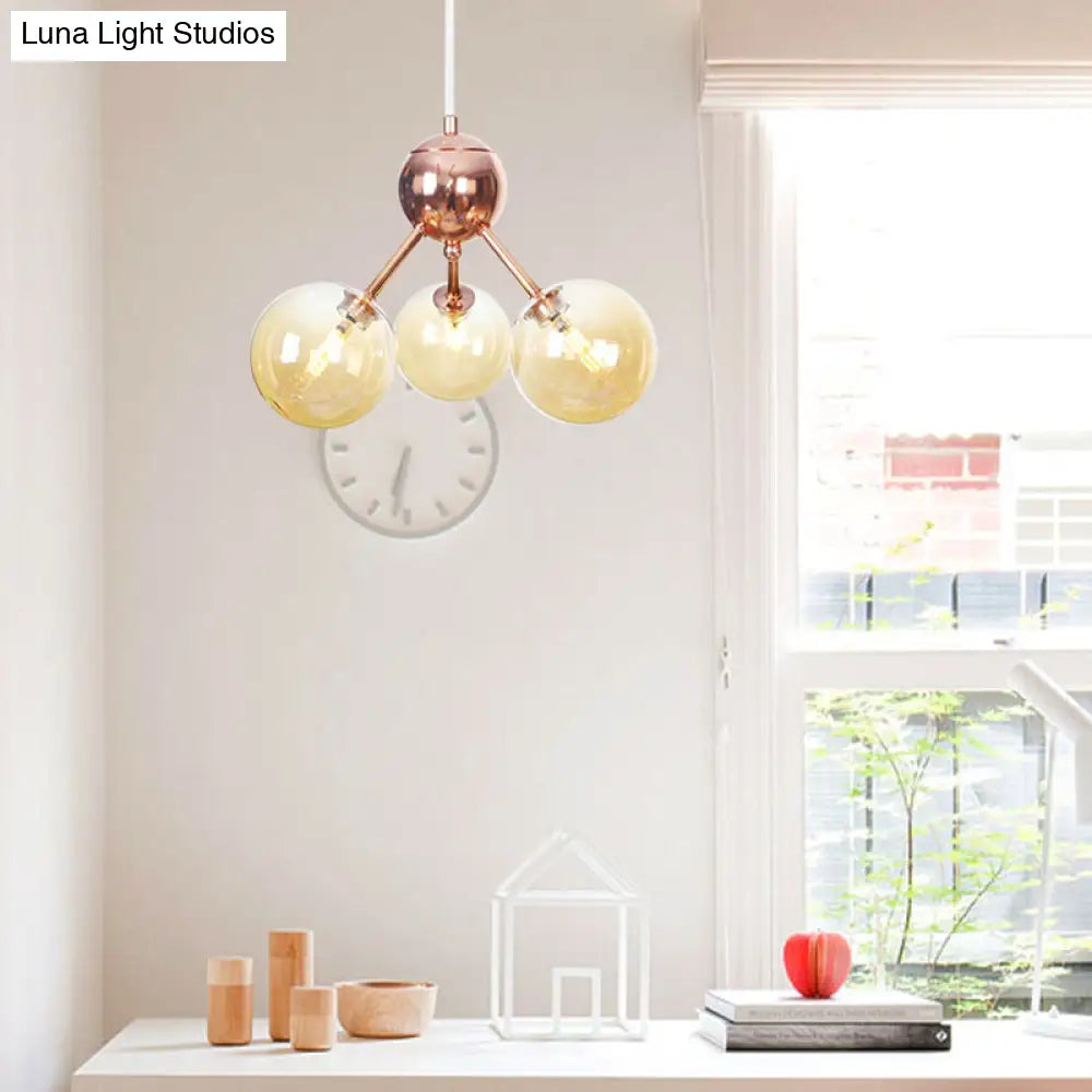 Lámpara de araña vintage de cobre con pantallas esféricas de cristal transparente/ámbar - 3/9/12 luces, diseño de ramas - 33/70/86 cm de ancho