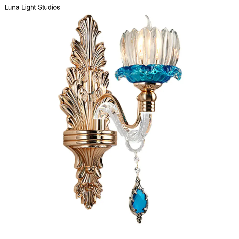 Lámpara de pared antigua de cristal azul con forma de capullo de flor para sala de estar