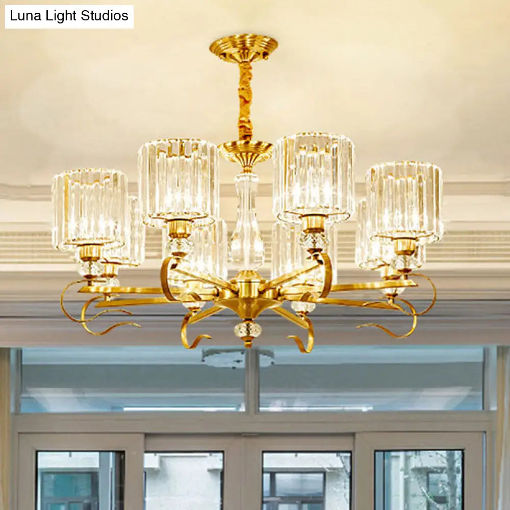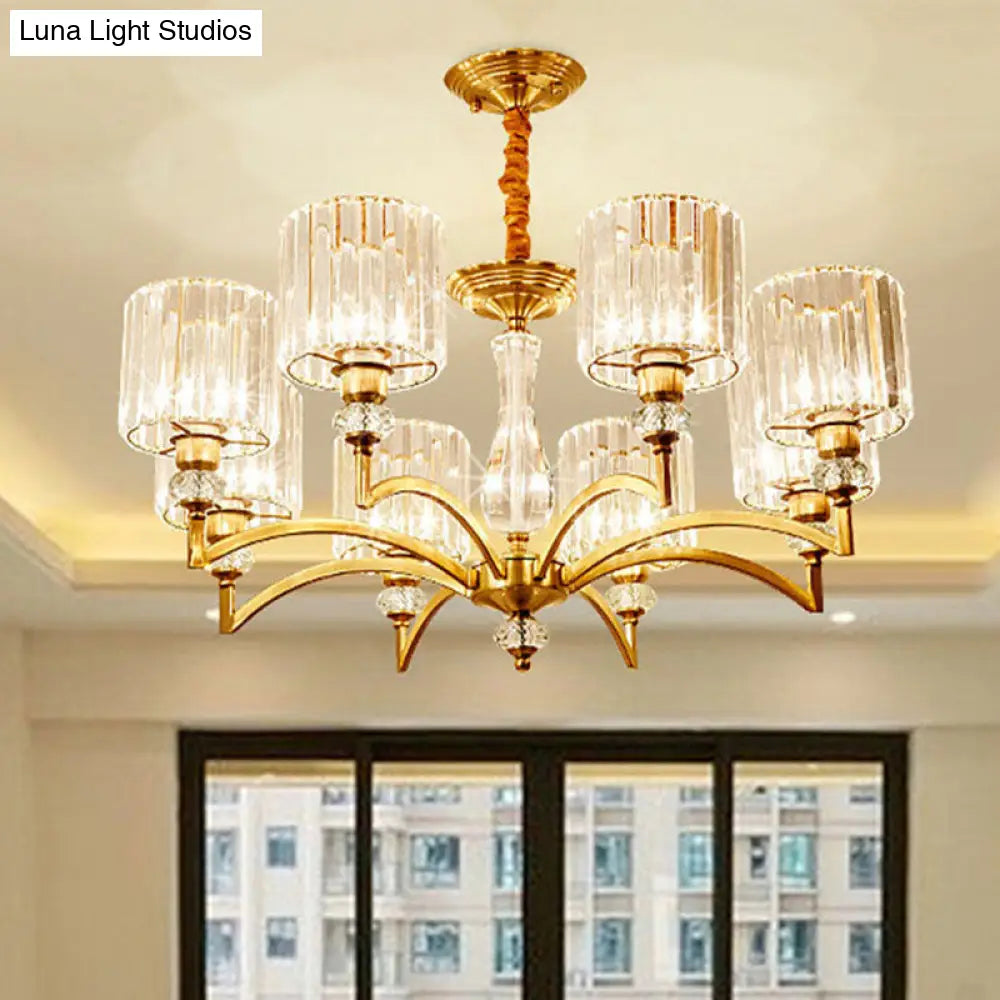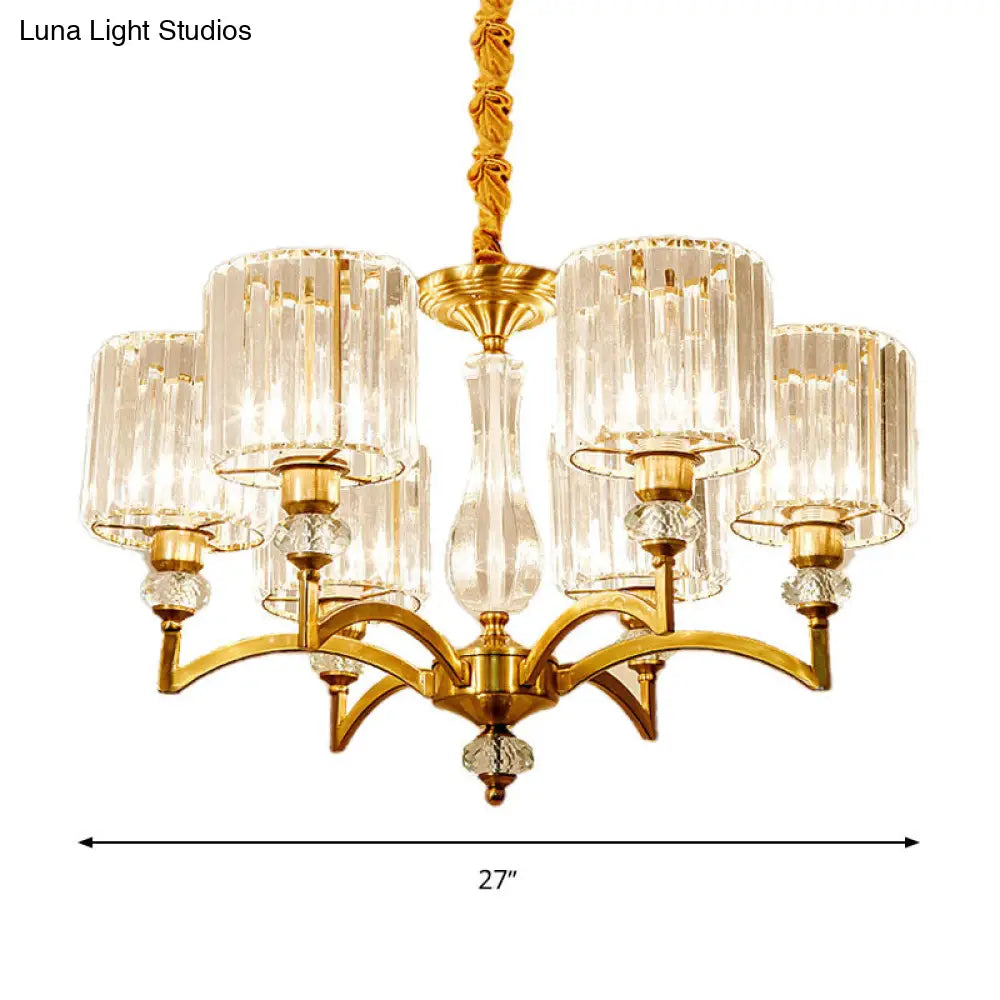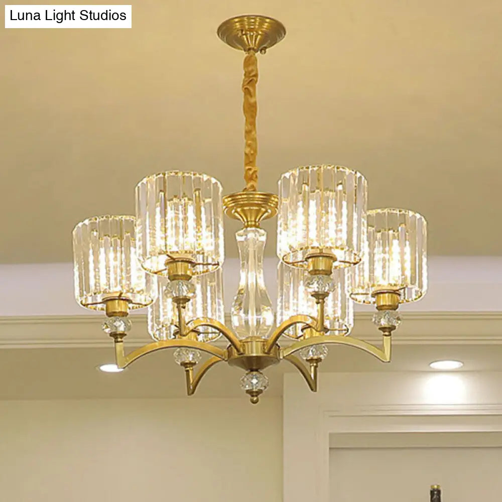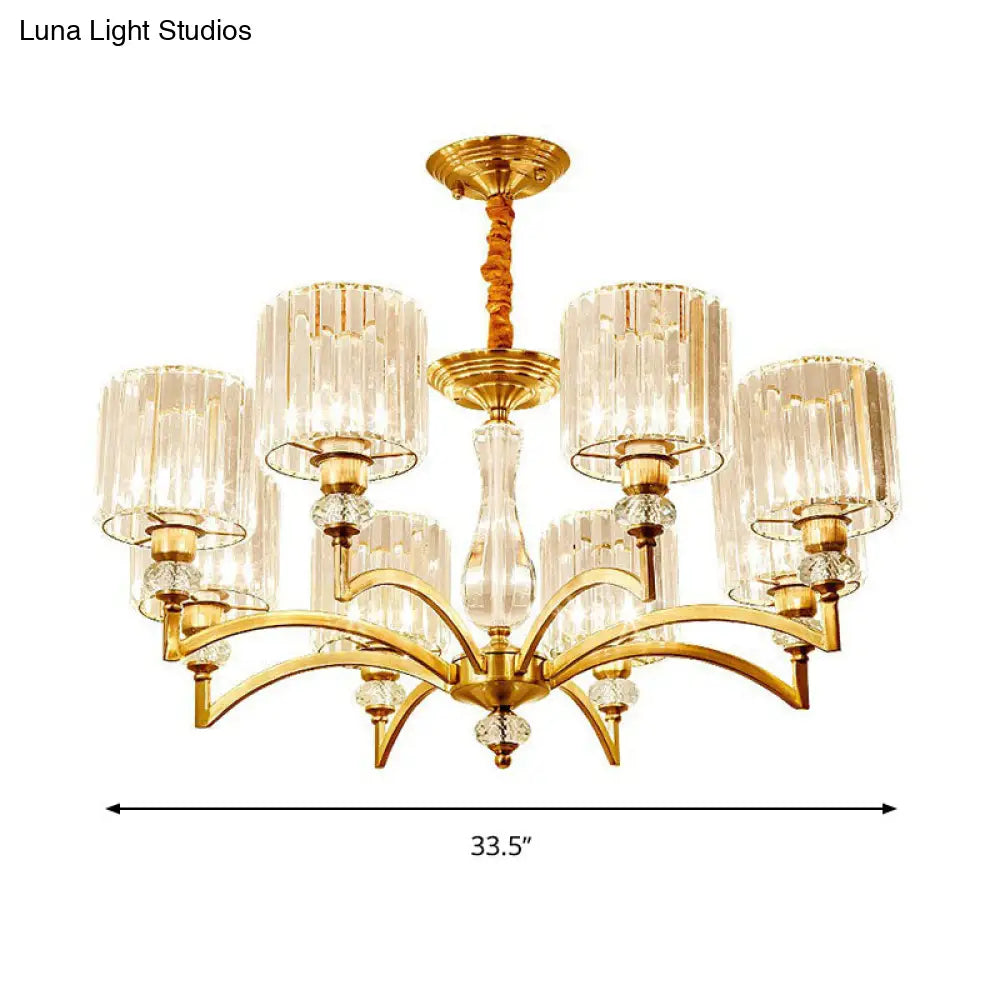 Lámpara de techo colgante de latón contemporánea con forma de cilindro de cristal facetado y 3/6/8 bombillas - 23,5"/27"/33,5" de ancho