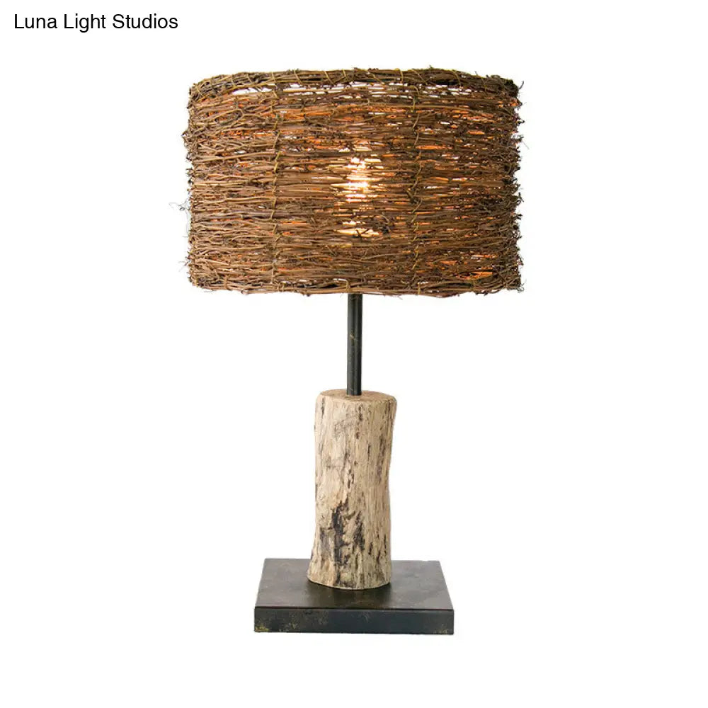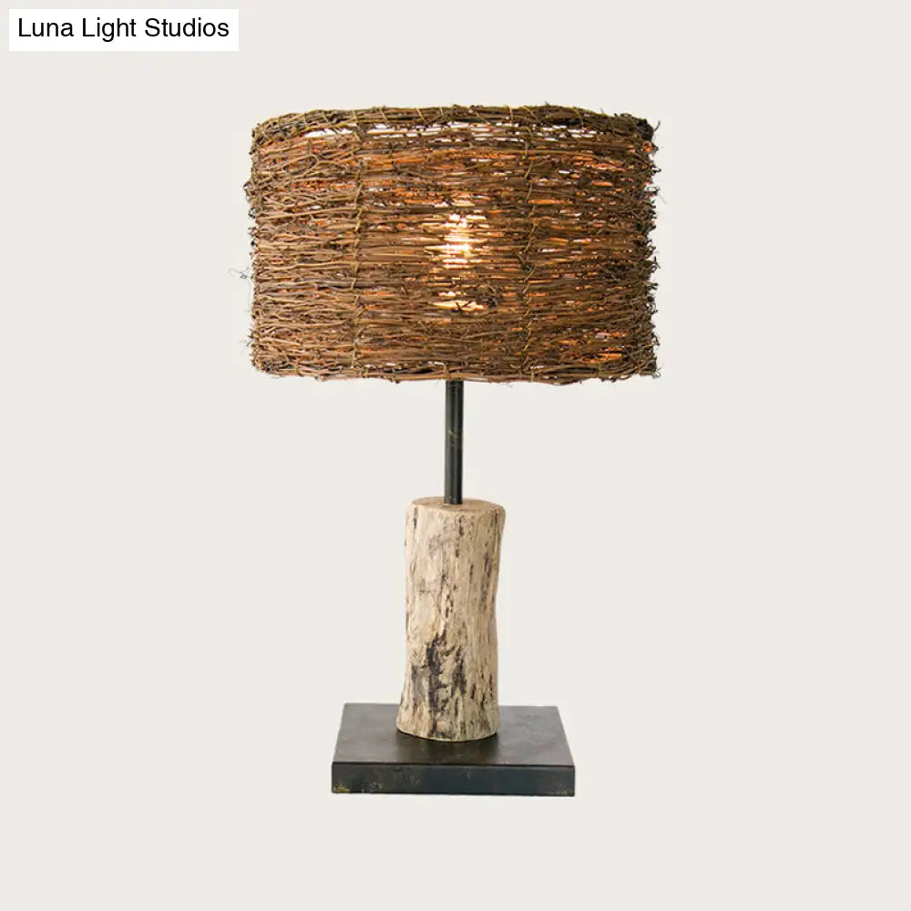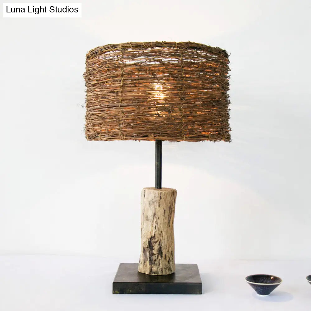 Lámpara de escritorio cilíndrica de bambú asiático - Marrón, 1 cabezal, iluminación de trabajo para sala de estar