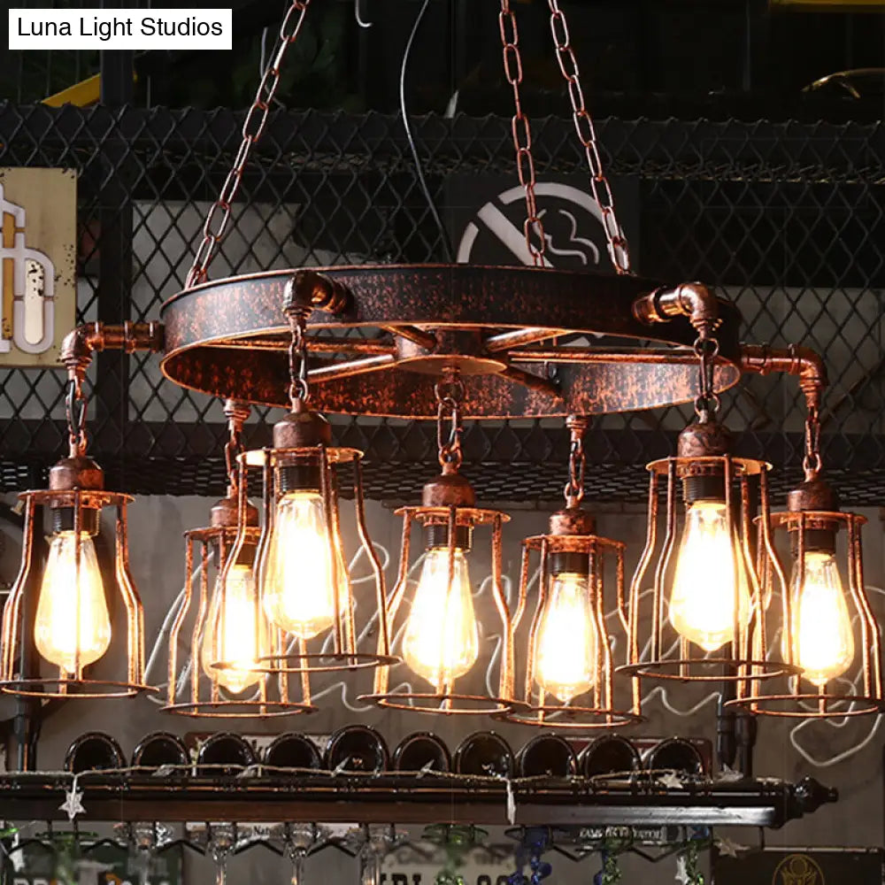 Lámpara colgante de estilo rústico con 7 luces, acabado en óxido oscuro, jaula de hierro forjado y diseño de rueda.