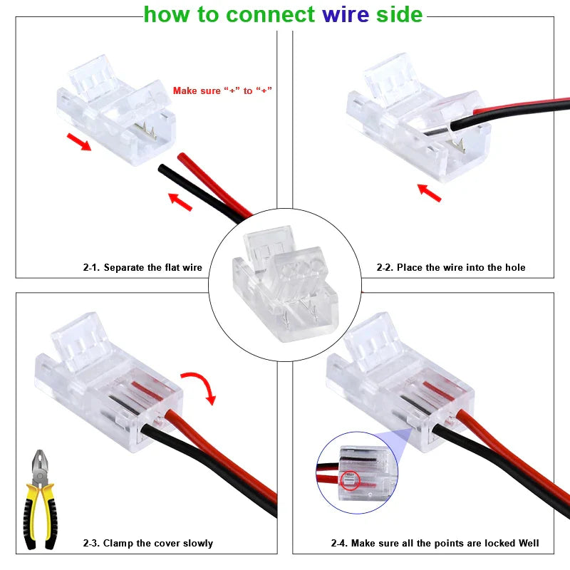 Presentamos los conectores de 2 pines para tiras LED COB 2835/5050 SMD, diseñados con precisión e innovación para optimizar su experiencia de iluminación. Estos conectores se integran perfectamente con sus tiras LED, proporcionando una conexión segura y fiable para una iluminación ininterrumpida.