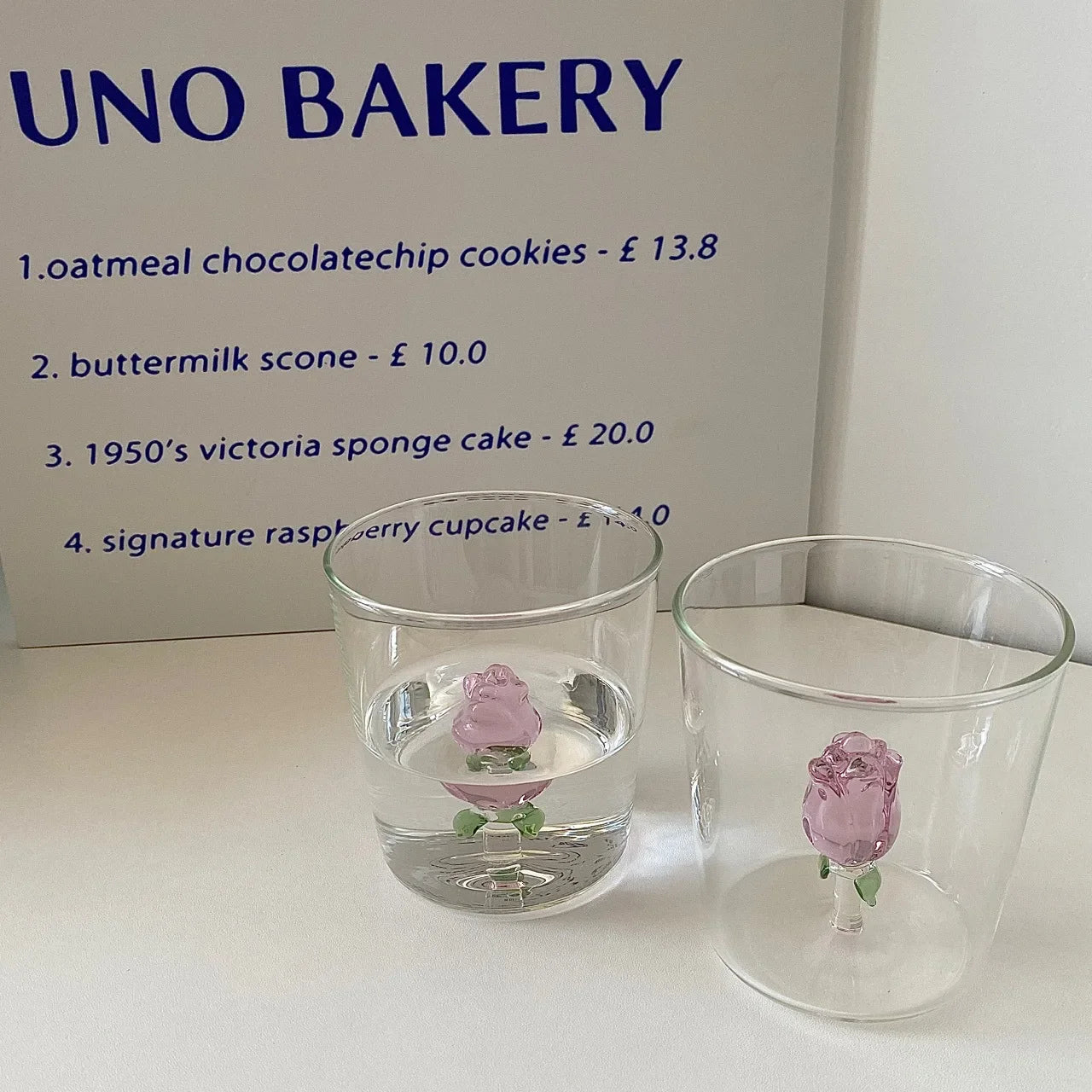Taza de desayuno DecorBites™ de vidrio rosa 3D con asa para jugo, café, té o leche