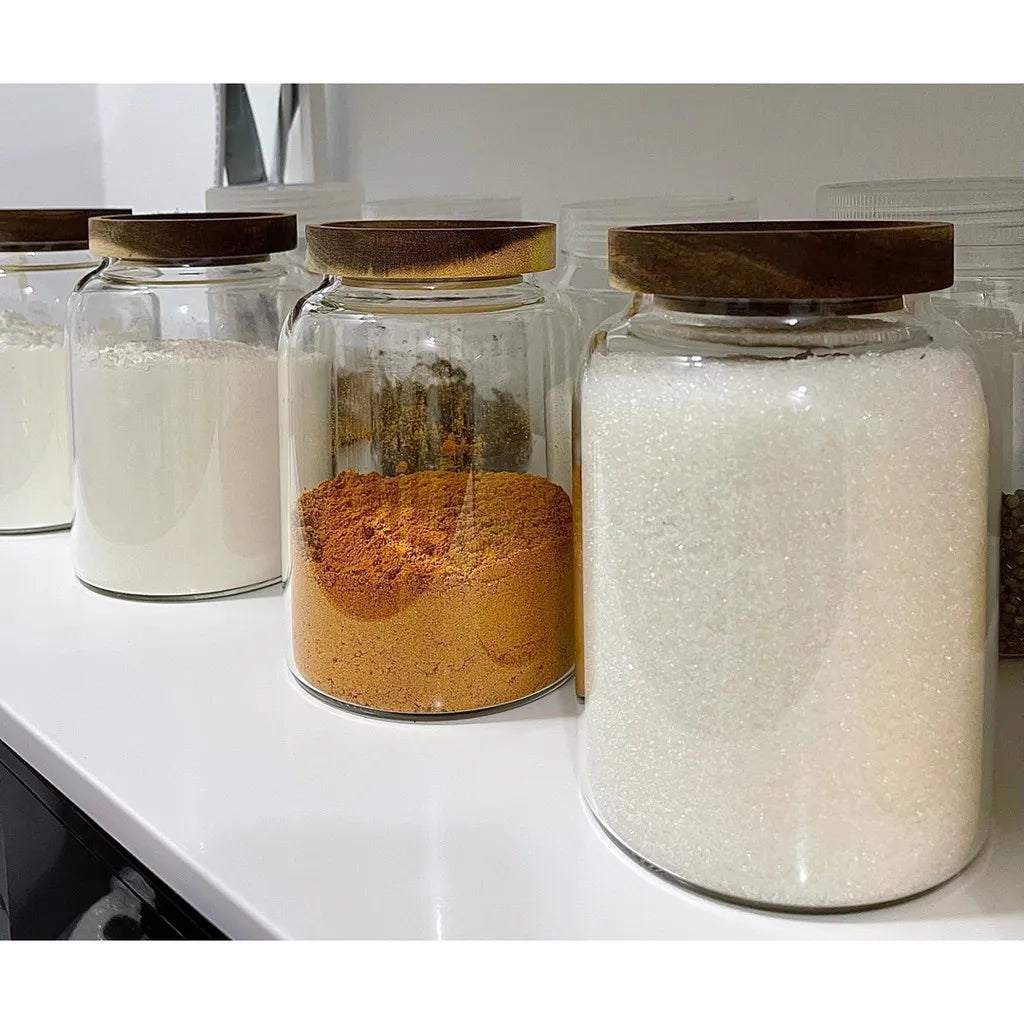 Elaborados con vidrio de alta calidad, estos frascos son transparentes, lo que permite ver fácilmente su contenido. Las tapas de madera de acacia proporcionan un cierre hermético, garantizando que los alimentos se mantengan frescos durante más tiempo.