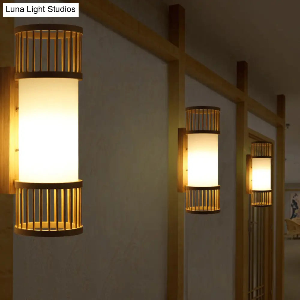 Aplique de pared DecorBites™ con pantalla cilíndrica de bambú asiático en color beige - Elegante lámpara de pared de 1 cabezal para escaleras