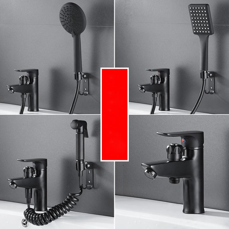 Grifo monomando para lavabo DecorBites™ de latón negro con cabezal de ducha y mezclador de agua fría y caliente.