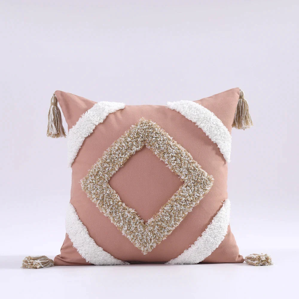 Funda de cojín DecorBites™ Boho con borlas y mechones, 45x45cm - Funda de cojín decorativa de algodón azul y rosa