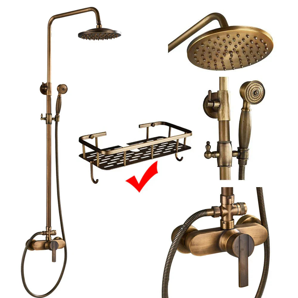 Juego de mezclador de grifo de ducha de latón DecorBites™ con cabezal de lluvia de 8", estante de almacenamiento y ganchos