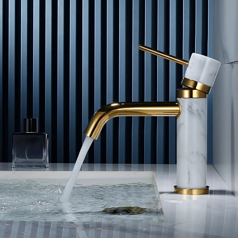Este grifo, con un cabezal de plato cerámico y un solo mando para un control sencillo de la temperatura y el caudal, ofrece agua fría y caliente. Su acabado en oro cepillado le aporta un toque de elegancia, mientras que los detalles de mármol crean un punto focal único y lujoso para su espacio.